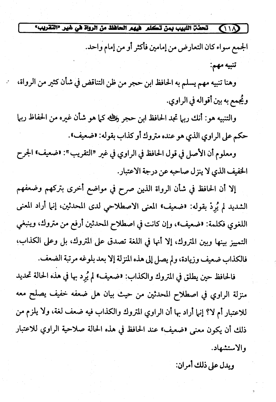 والتنبيه هو: أنك ربما تجد الحافظ ابن حجر رحمه الله كما هو شأن غيره من الحفاظ ربما حكم على الراوي الذي هو عنده متروك أو كذاب بقوله: "ضعيف".