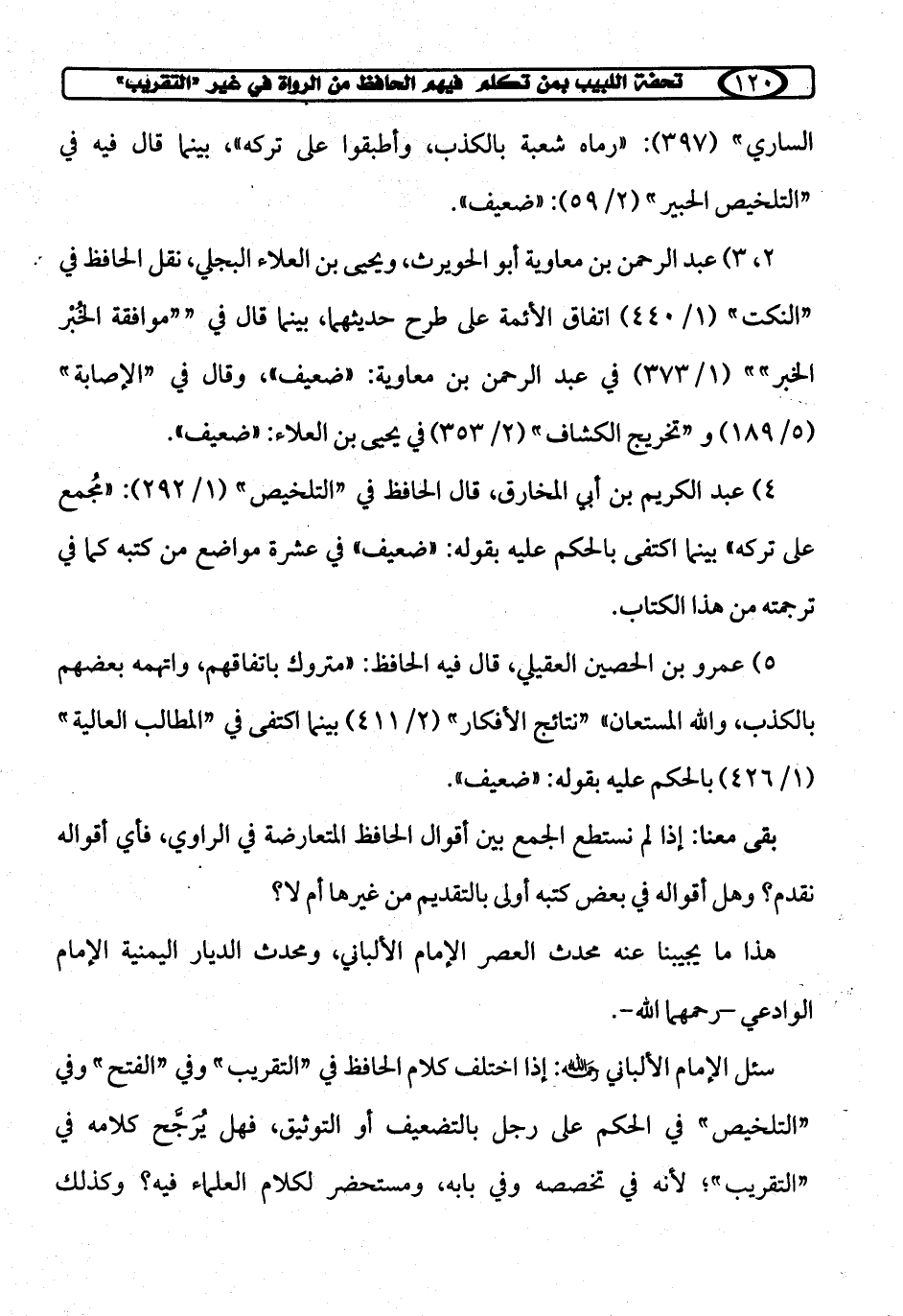 سئل الإمام الألباني رحمه الله: إذا اختلف كلام الحافظ في "التقريب" وفي "الفتح" وفي "التلخيص" في الحكم على رجل بالتضعيف أو التوثيق، فهل يُرَجَّح كلامه في "التقريب"؛ لأنه في تخصصه وفي بابه، ومستحضر لكلام العلماء فيه؟ وكذلك