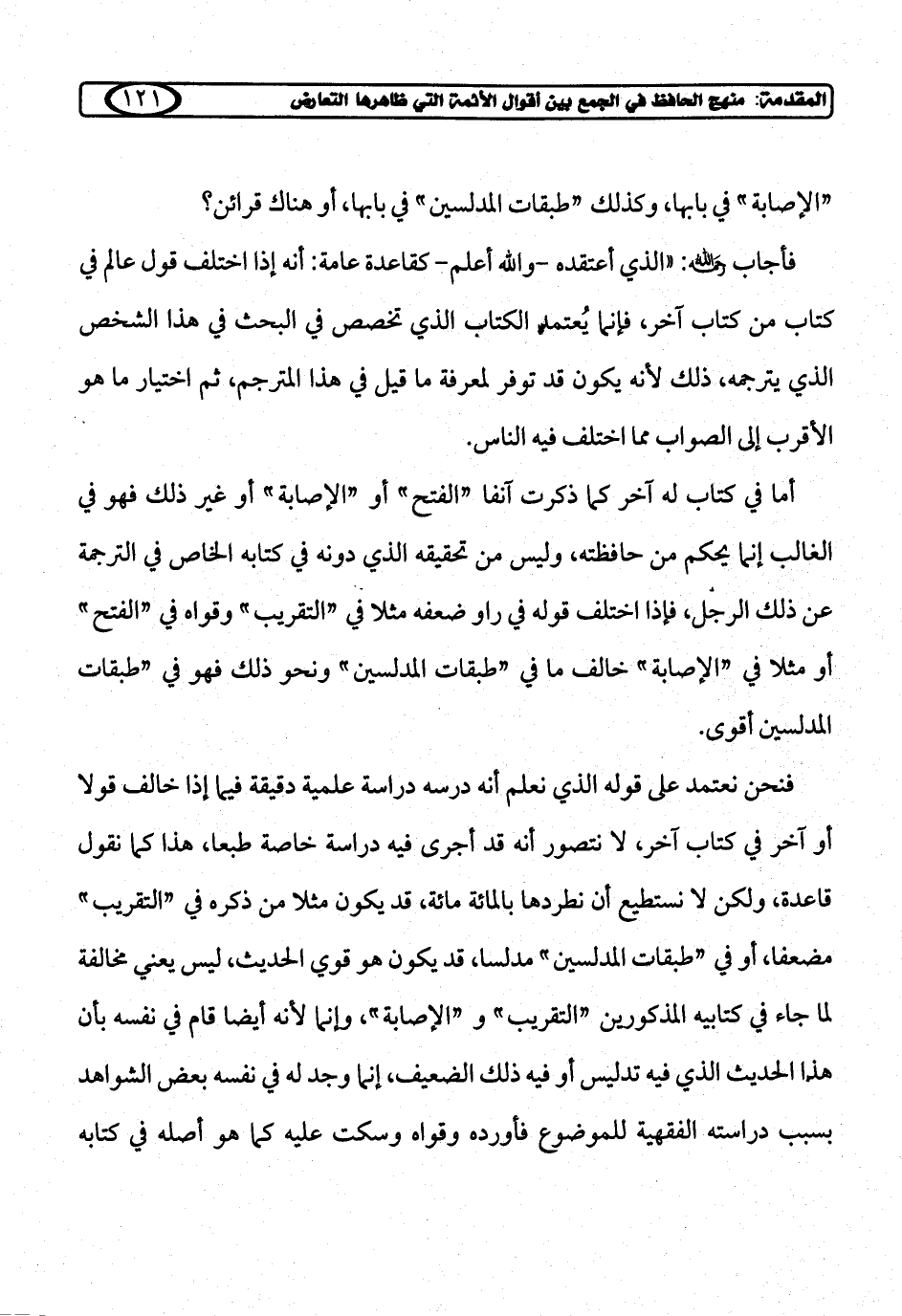 فنحن نعتمد على قوله الذي نعلم أنه درسه دراسة علمية دقيقة فيما إذا خالف قولا أو آخر في كتاب آخر، لا نتصور أنه قد أجرى فيه دراسة خاصة طبعا، هذا كما نقول قاعدة، ولكن لا نستطيع أن نطردها بالمائة مائة، قد يكون مثلا من ذكره في "التقريب" مضعفا، أو في "طبقات المدلسين" مدلسا، قد يكون هو قوي الحديث، ليس يعني مخالفة لما جاء في كتابيه المذكورين "التقريب" و"الإصابة"، وإنما لأنه أيضا قام في نفسه بأن هذا الحديث الذي فيه تدليس أو فيه ذلك الضعيف، إنما وجد له في نفسه بعض الشواهد بسبب دراسته الفقهية للموضوع فأورده وقواه وسكت عليه كما هو أصله في كتابه