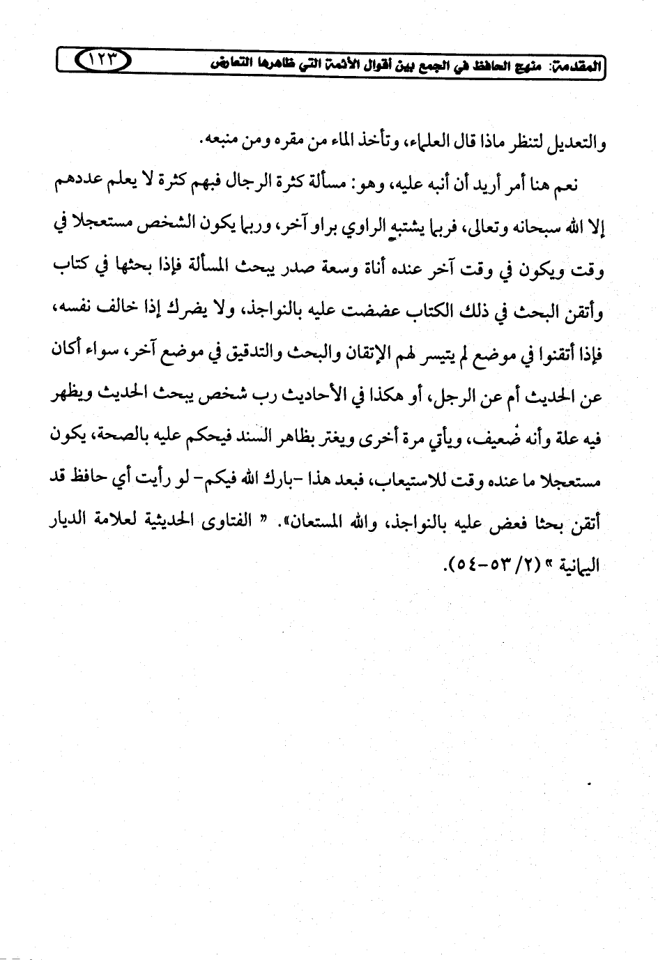 نعم هنا أمر أريد أن أنبه عليه، وهو: مسألة كثرة الرجال فبهم كثرة لا يعلم عددهم إلا الله سبحانه وتعالى، فربما يشتبه الراوي براو آخر، وربما يكون الشخص مستعجلا في وقت ويكون في وقت آخر عنده أناة وسعة صدر يبحث المسألة فإذا بحثها في كتاب وأتقن البحث في ذلك الكتاب عضضت عليه بالنواجذ، ولا يضرك إذا خالف نفسه، فإذا أتقنوا في موضع لم يتيسر لهم الإتقان والبحث والتدقيق في موضع آخر، سواء أكان عن الحديث أم عن الرجل، أو هكذا في الأحاديث رب شخص يبحث الحديث ويظهر فيه علة وأنه ضعيف، ويأتي مرة أخرى ويغتر بظاهر السند فيحكم عليه بالصحة، يكون مستعجلا ما عنده وقت للإستيعاب، فبعد هذا - بارك الله فيكم- لو رأيت أي حافظ قد أتقن بحثا فعض عليه بالنواجذ، والله المستعان". "الفتاوى الحديثية لعلامة الديار اليمانية" (2/ 53 - 54).