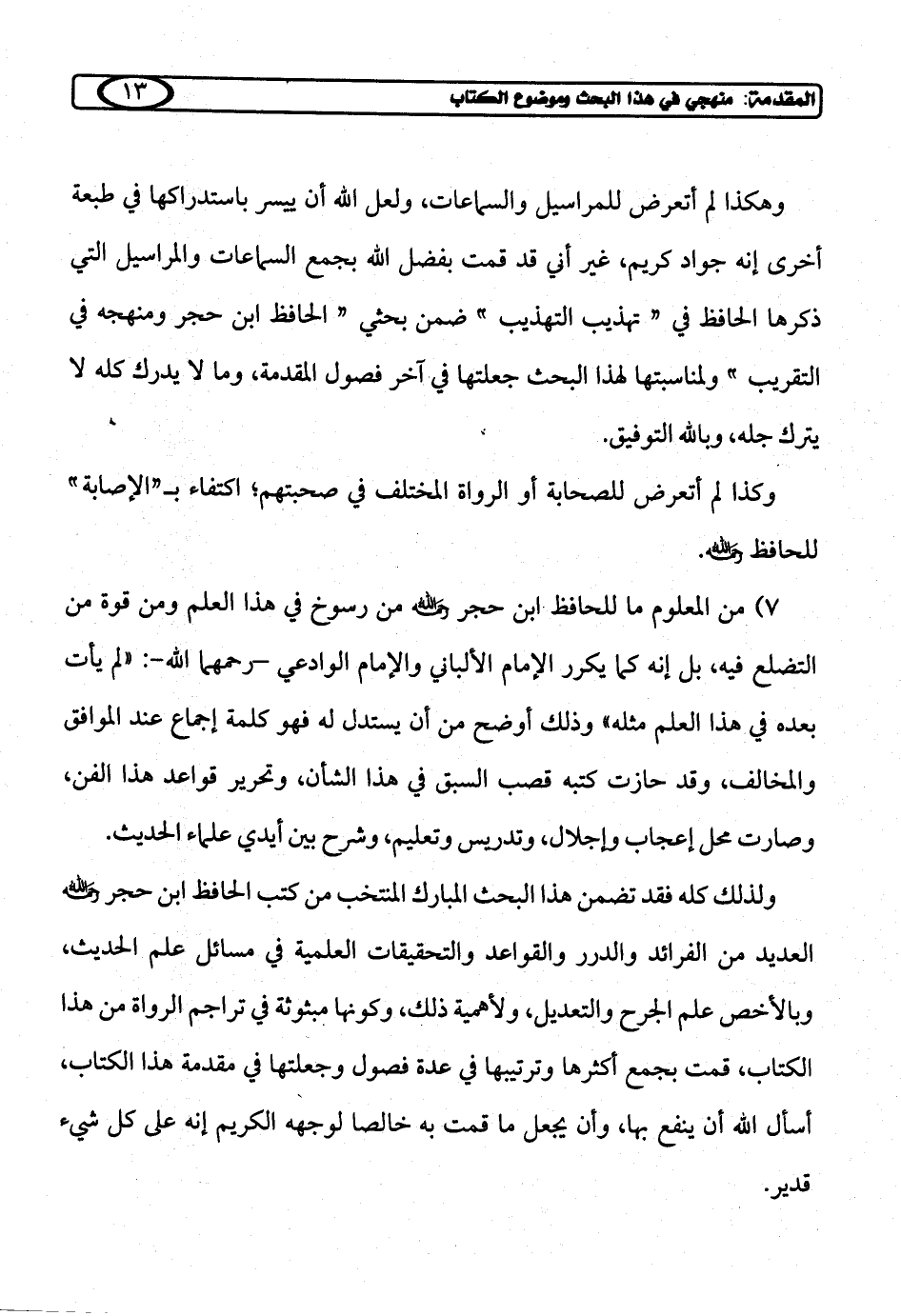 وهكذا لم أتعرض للمراسيل والسماعات، ولعل الله أن ييسر باستدراكها في طبعة أخرى إنه جواد كريم، غير أني قد قمت بفضل الله بجمع السماعات والمراسيل التي ذكرها الحافظ في "تهذيب التهذيب" ضمن بحثي "الحافظ ابن حجر ومنهجه في التقريب" ولمناسبتها لهذا البحث جعلتها في آخر فصول المقدمة، وما لا يدرك كله لا يترك جله، وبالله التوفيق.