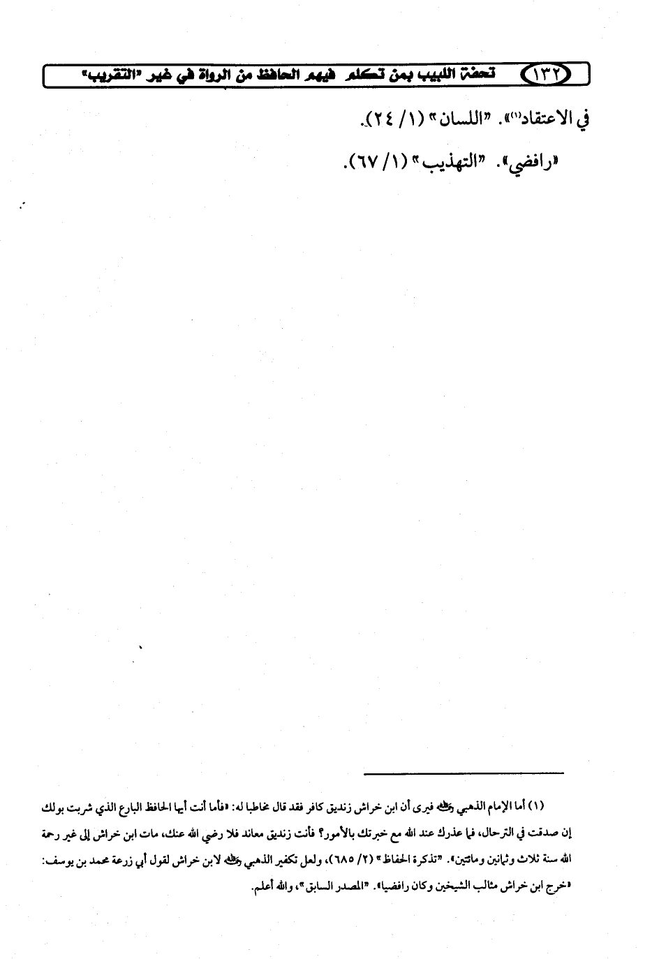 (¬1) أما الإمام الذهبي رحمه الله فيرى أن ابن خراش زنديق كافر فقد قال مخاطبا له: "فأما أنت أيها الحافظ البارع الذي شربت بولك إن صدقت في الترحال، فما عذرك عند الله مع خبرتك بالأمور؟ فأنت زنديق معاند فلا رضي الله عنك، مات ابن خراش إلى غير رحمة الله سنة ثلاث وثمانين ومائتين". "تذكرة الحفاظ" (2/ 685)، ولعل تكفير الذهبي رحمه الله لابن خراش لقول أبي زرعة محمد بن يوسف: "خرج ابن خراش مثالب الشيخين وكان رافضيا". "المصدر السابق"، والله أعلم.