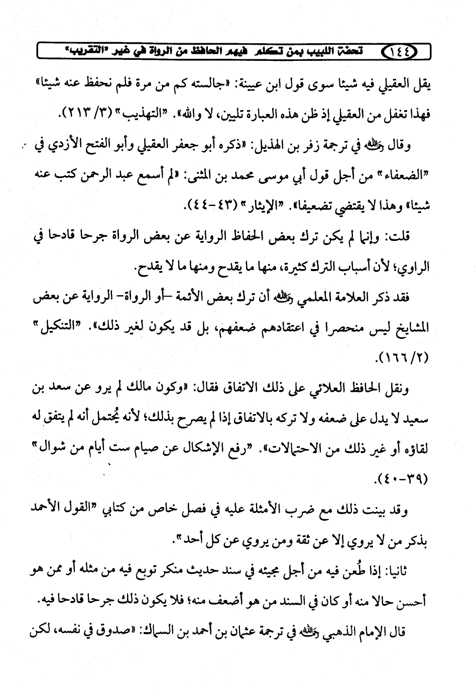 وقال رحمه الله في ترجمة زفر بن الهذيل: "ذكره أبو جعفر العقيلي وأبو الفتح الأزدي في "الضعفاء" من أجل قول أبي موسى محمد بن المثنى: "لم أسمع عبد الرحمن كتب عنه شيئا" وهذا لا يقتضي تضعيفا". "الإيثار" (43 - 44).
