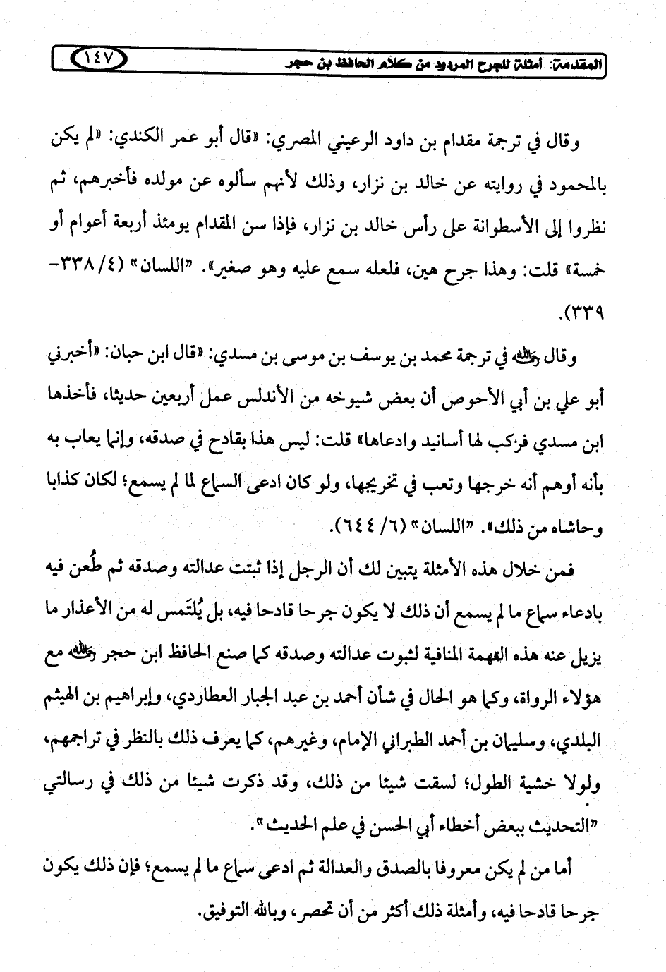 فمن خلال هذه الأمثلة يتبين لك أن الرجل إذا ثبتت عدالته وصدقه ثم طُعن فيه بادعاء سماع ما لم يسمع أن ذلك لا يكون جرحا قادحا فيه، بل يُلتَمس له من الأعذار ما يزيل عنه هذه التهمة المنافية لثبوت عدالته وصدقه كما صنع الحافظ ابن حجر رحمه الله مع هؤلاء الرواة، وكما هو الحال في شأن أحمد بن عبد الجبار العطاردي، وإبراهيم بن الهيثم البلدي، وسليمان بن أحمد الطبراني الإمام، وغيرهم، كما يعرف ذلك بالنظر في تراجمهم، ولولا خشية الطول؛ لسقت شيئا من ذلك، وقد ذكرت شيئا من ذلك في رسالتي "التحديث ببعض أخطاء أبي الحسن في علم الحديث".