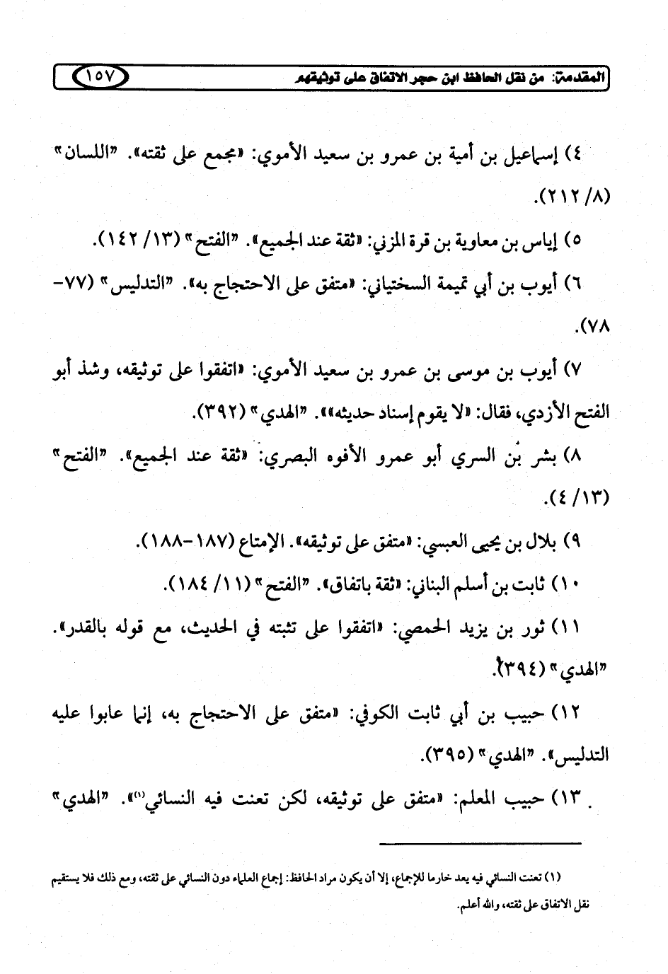 (¬1) تعنت النسائي فيه يعد خارما للإجماع، إلا أن يكون مراد الحافظ: إجماع العلماء دون النسائي على ثقته، ومع ذلك فلا يستقيم نقل الإتفاق على ثقته، والله أعلم.