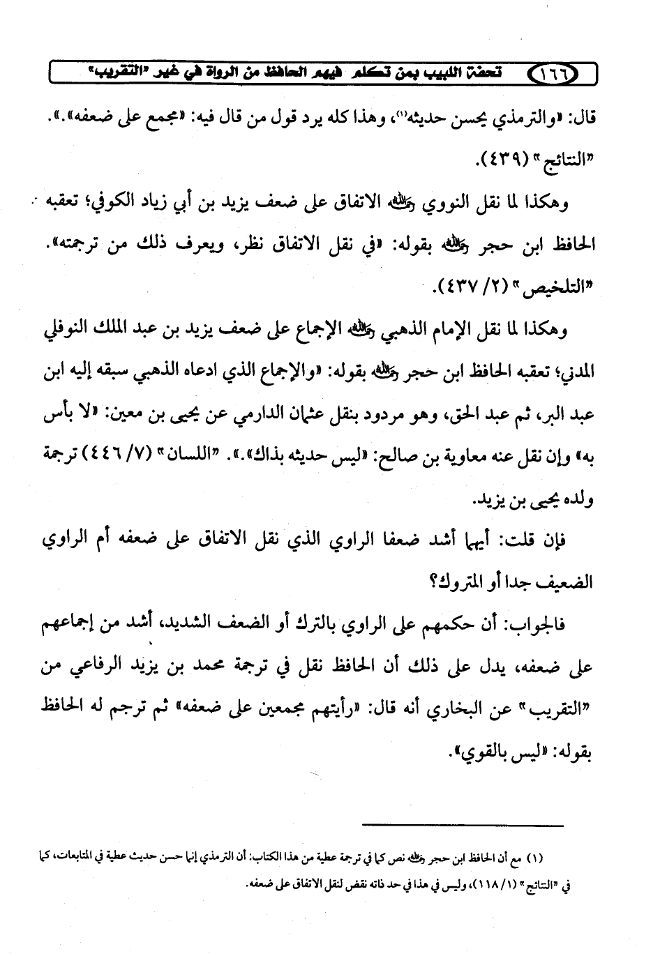 (¬1) مع أن الحافظ ابن حجر رحمه الله نص كما في ترجمة عطية من هذا الكتاب: أن الترمذي إنما حسن حديث عطية في المتابعات، كما في "النتائج" (1/ 118)، وليس في هذا في حد ذاته نقض لنقل الإتفاق على ضعفه.