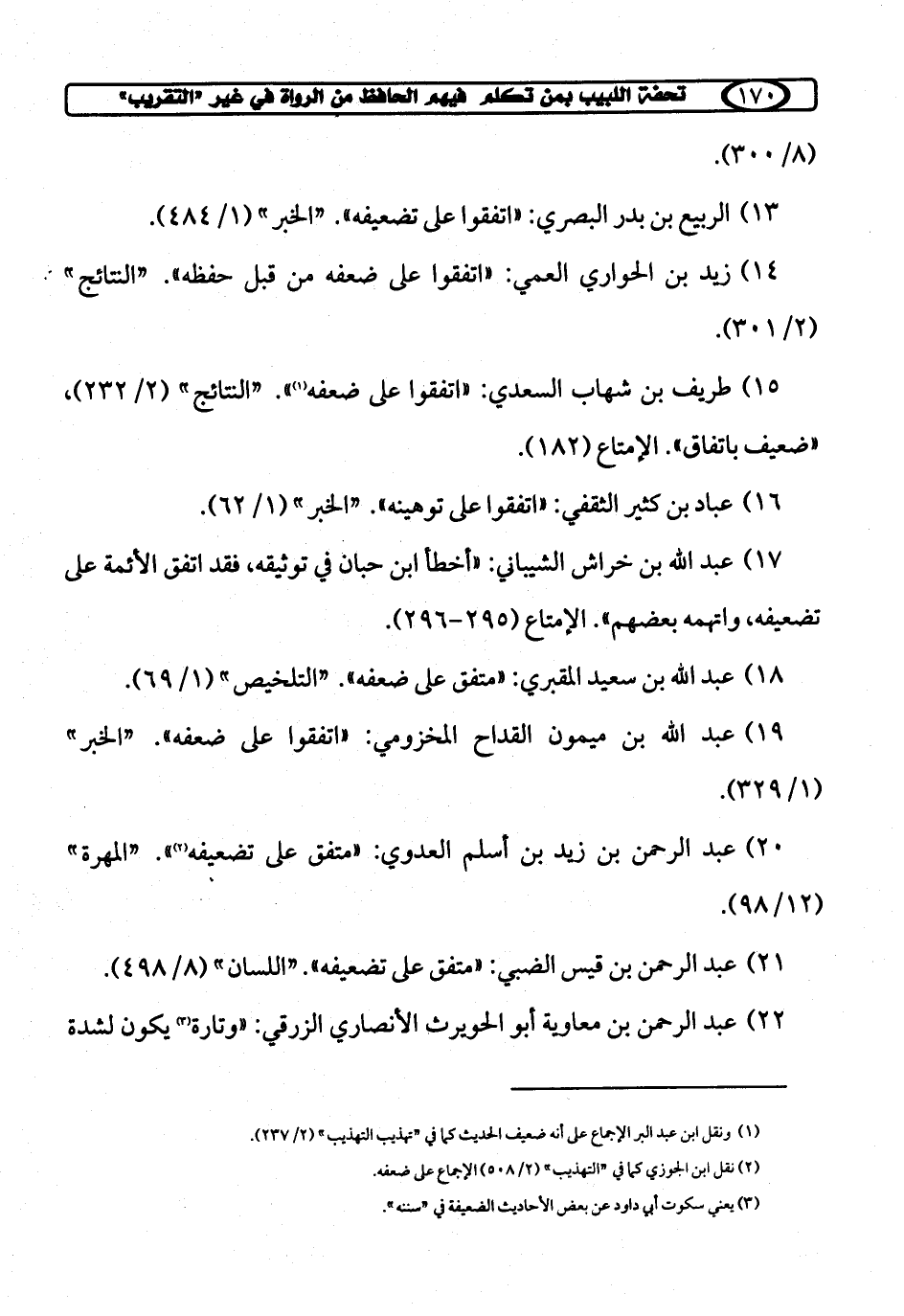 21) عبد الرحمن بن قيس الضبي: "متفق على تضعيفه". "اللسان" (8/ 498).