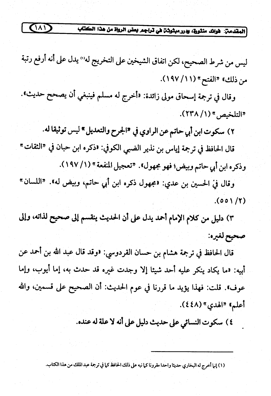 قال الحافظ في ترجمة هشام بن حسان القردوسي: "وقد قال عبد الله بن أحمد عن أبيه: "ما يكاد ينكر عليه أحد شيئا إلا وجدت غيره قد حدث به، إما أيوب، وإما عوف". قلت: فهذا يؤيد ما قررنا في عوم الحديث: أن الصحيح على قسمين، والله أعلم" "الهدي" (448).