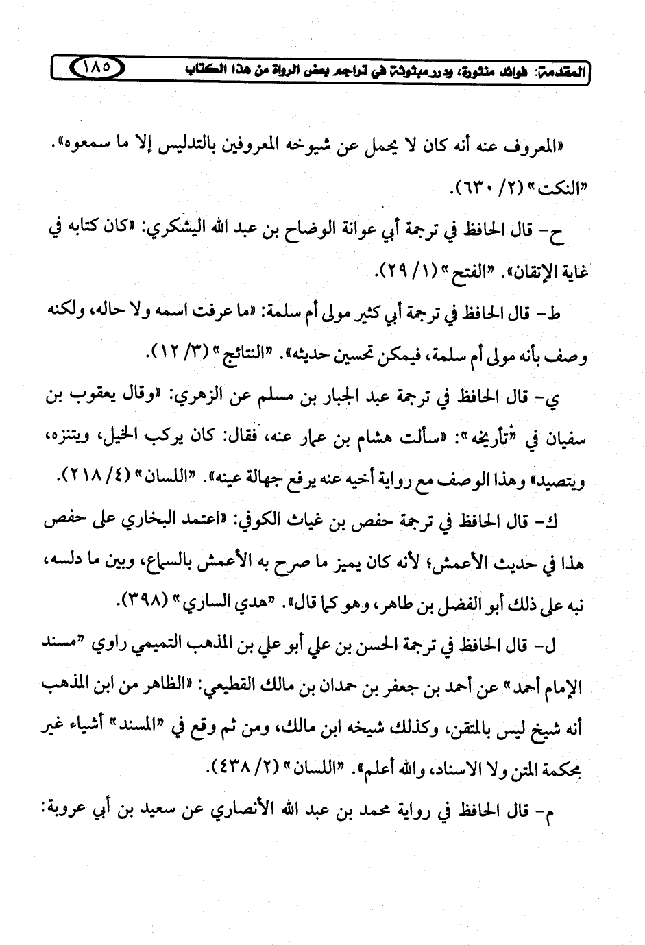 ي - قال الحافظ في ترجمة عبد الجبار بن مسلم عن الزهري: "وقال يعقوب بن سفيان في "تأريخه": "سألت هشام بن عمار عنه، فقال: كان يركب الخيل، ويتنزه، ويتصيد" وهذا الوصف مع رواية أخيه عنه يرفع جهالة عينه". "اللسان" (4/ 218).