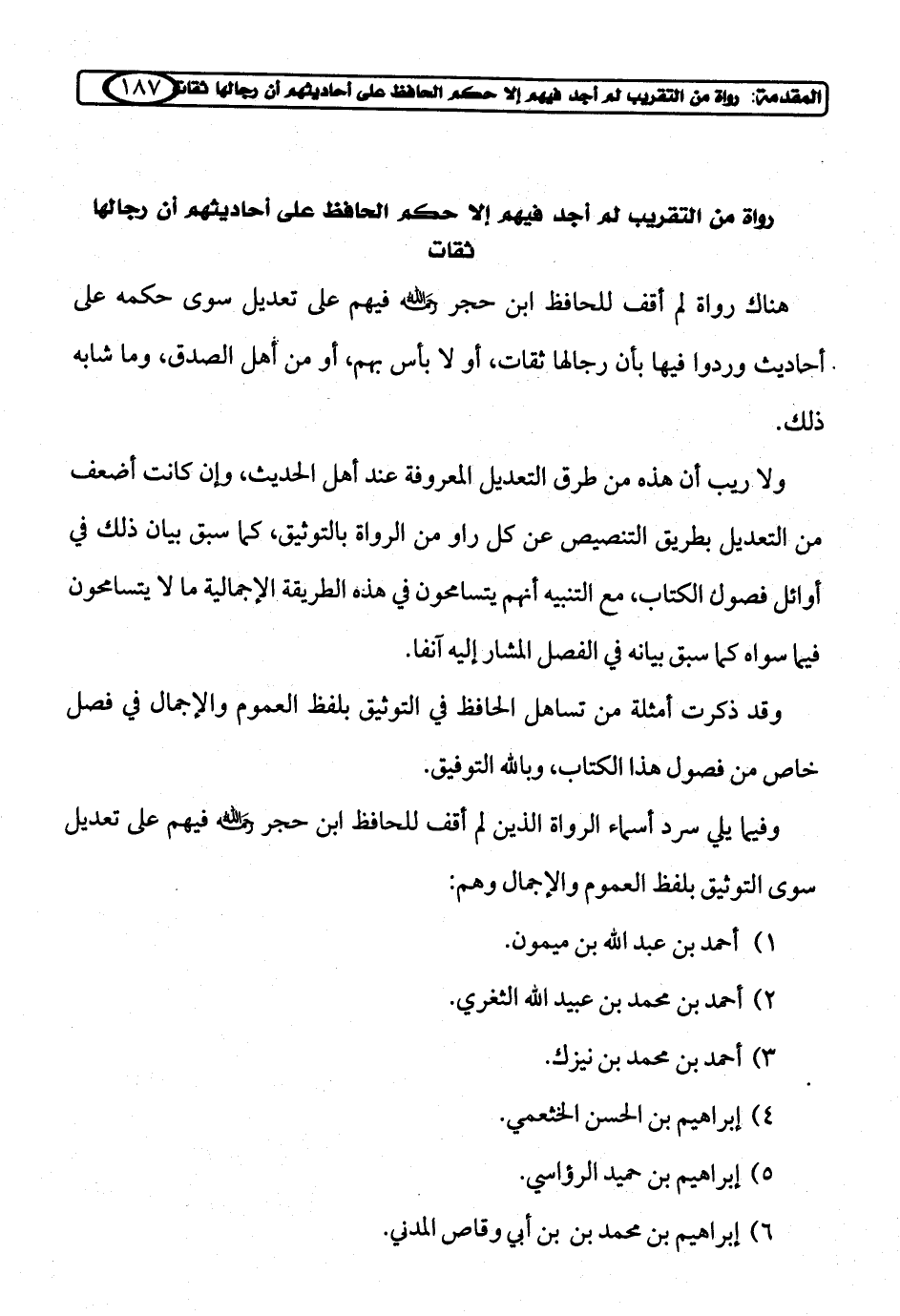 وفيما يلي سرد أسماء الرواة الذين لم أقف للحافظ ابن حجر رحمه الله فيهم على تعديل سوى التوثيق بلفظ العموم والإجمال وهم: