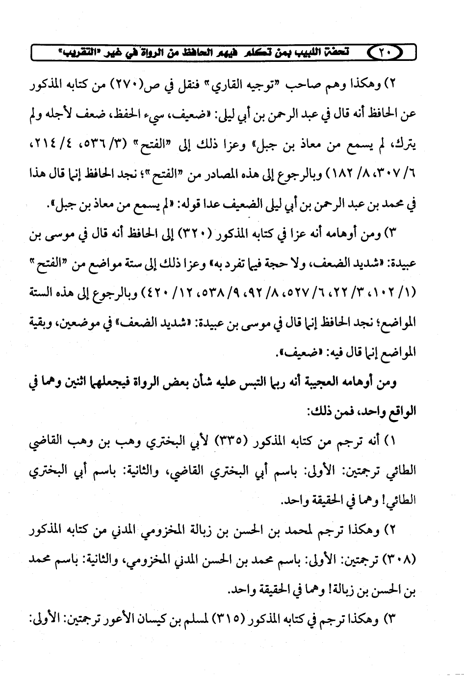 2) وهكذا وهم صاحب "توجيه القاري" فنقل في ص (270) من كتابه المذكور عن الحافظ أنه قال في عبد الرحمن بن أبي ليلى: "ضعيف، سيء الحفظ، ضعف لأجله ولم يترك، لم يسمع من معاذ بن جبل" وعزا ذلك إلى "الفتح" (3/ 536، 4/ 214، 6/ 307، 8/ 182) وبالرجوع إلى هذه المصادر من "الفتح"؛ نجد الحافظ إنما قال هذا في محمد بن عبد الرحمن بن أبي ليلى الضعيف عدا قوله: "لم يسمع من معاذ بن جبل".