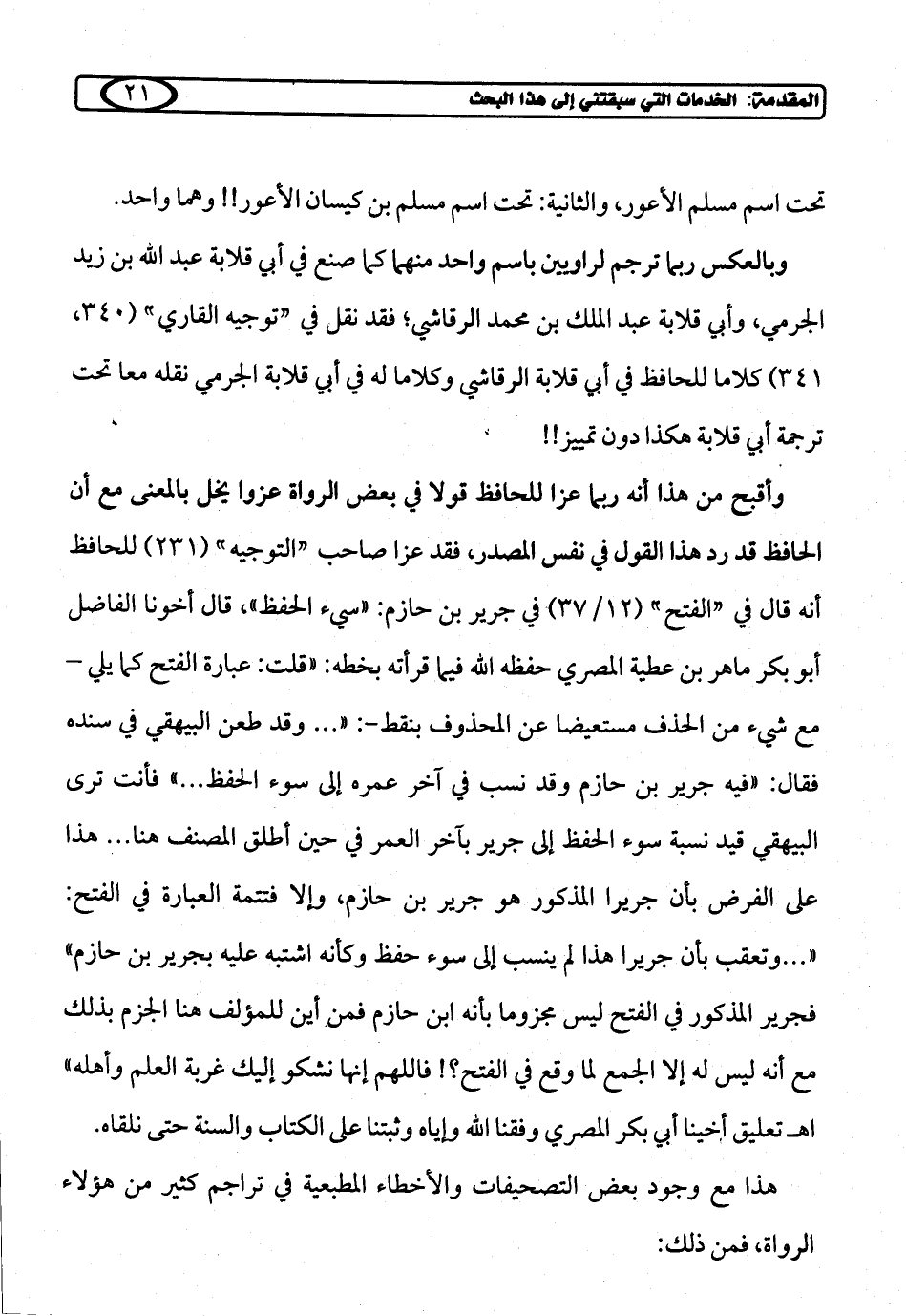 وأقبح من هذا أنه ربما عزا للحافظ قولا في بعض الرواة عزوا يخل بالمعنى مع أن الحافظ قد رد هذا القول في نفس المصدر، فقد عزا صاحب "التوجيه" (231) للحافظ أنه قال في "الفتح" (12/ 37) في جرير بن حازم: "سيء الحفظ"، قال أخونا الفاضل أبو بكر ماهر بن عطية المصري حفظه الله فيما قرأته بخطه: "قلت: عبارة الفتح كما يلي - مع شيء من الحذف مستعيضا عن المحذوف بنقط -: " ... وقد طعن البيهقي في سنده فقال: "فيه جرير بن حازم وقد نسب في آخر عمره إلى سوء الحفظ ... " فأنت ترى البيهقي قيد نسبة سوء الحفظ إلى جرير بآخر العمر في حين أطلق المصنف هنا ... هذا على الفرض بأن جريرا المذكور هو جرير بن حازم، وإلا فتتمة العبارة في الفتح: " ... وتعقب بأن جريرا هذا لم ينسب إلى سوء حفظ وكأنه اشتبه عليه بجرير بن حازم" فجرير المذكور في الفتح ليس مجزوما بأنه ابن حازم فمن أين للمؤلف هنا الجزم بذلك مع أنه ليس له إلا الجمع لما وقع في الفتح؟ ! فاللهم إنها نشكو إليك غربة العلم وأهله" اهـ تعليق أخينا أبي بكر المصري وفقنا الله وإياه وثبتنا على الكتاب والسنة حتى نلقاه.