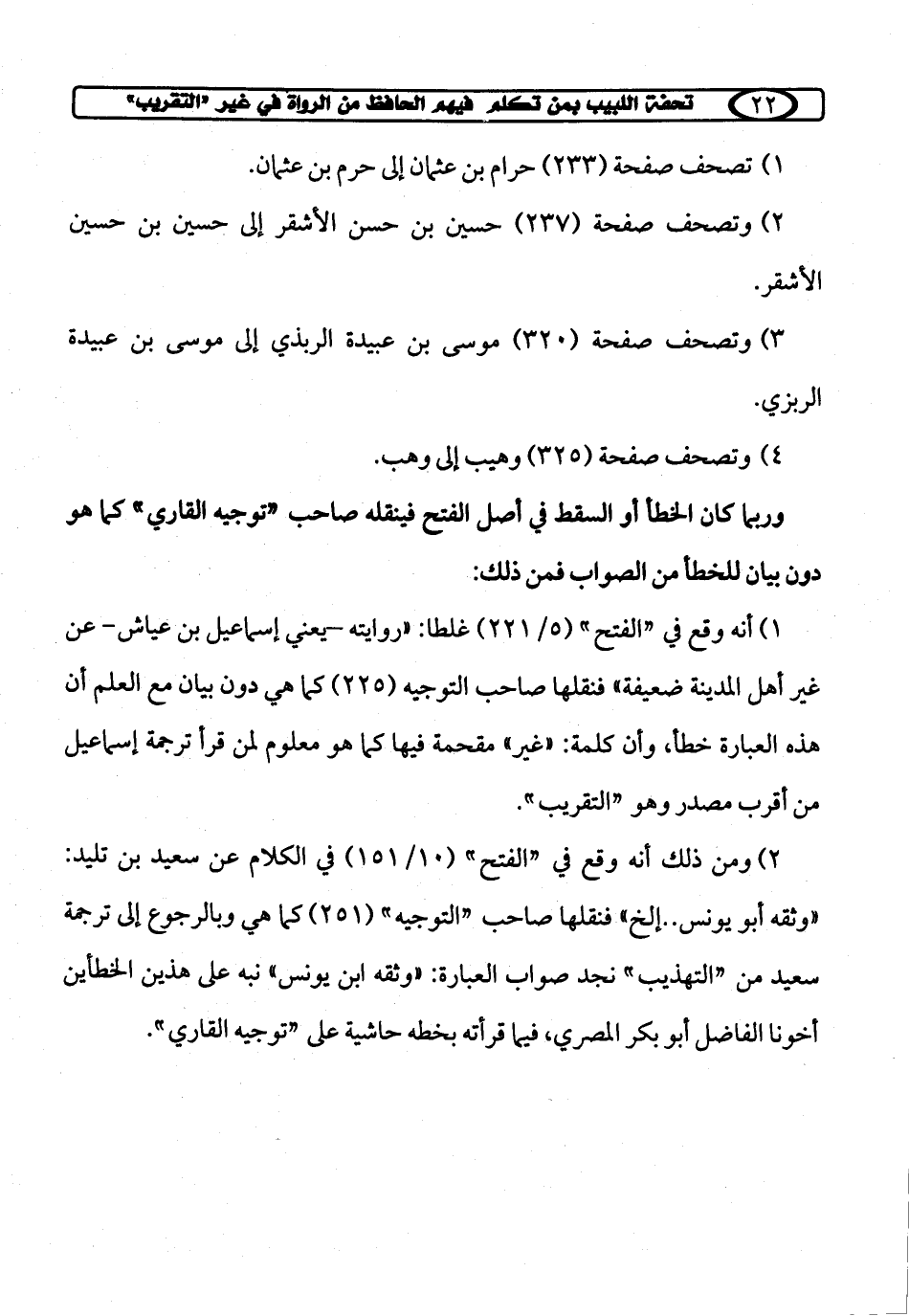 1) أنه وقع في "الفتح" (5/ 221) غلطا: "روايته - يعني إسماعيل بن عياش - عن غير أهل المدينة ضعيفة" فنقلها صاحب التوجيه (225) كما هي دون بيان مع العلم أن هذه العبارة خطأ، وأن كلمة: "غير" مقحمة فيها كما هو معلوم لمن قرأ ترجمة إسماعيل من أقرب مصدر وهو "التقريب".