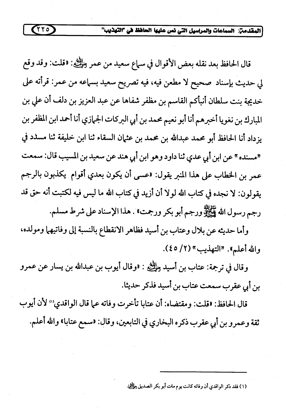 قال الحافظ بعد نقله بعض الأقوال في سماع سعيد من عمر - رضي الله عنه -: "قلت: وقد وقع لي حديث بإسناد صحيح لا مطعن فيه، فيه تصريح سعيد بسماعه من عمر: قرأته على خديجة بنت سلطان أنبأكم القاسم بن مظفر شفاها عن عبد العزيز بن دلف أن علي بن المبارك بن نغويا أخبرهم أنا أبو نعيم محمد بن أبي البركات الجمازي أنا أحمد ابن المظفر بن يزداد أنا الحافظ أبو محمد عبد الله بن محمد بن عثمان السقاء ثنا ابن خليفة ثنا مسدد في "مسنده" عن ابن أبي عدي ثنا داود وهو ابن أبي هند عن سعيد بن المسيب قال: سمعت عمر بن الخطاب على هذا المنبر يقول: "عسى أن يكون بعدي أقوام يكذبون بالرجم يقولون: لا نجده في كتاب الله لولا أن أزيد في كتاب الله ما ليس فيه لكتبت أنه حق قد رجم رسول الله - صلى الله عليه وسلم - ورجم أبو بكر ورجمت". هذا الإسناد على شرط مسلم.