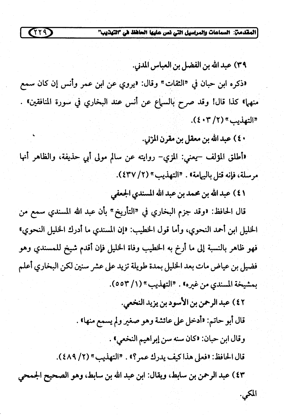 قال الحافظ: "وقد جزم البخاري في "التأريخ" بأن عبد الله المسندي سمع من الخليل ابن أحمد النحوي، وأما قول الخطيب: "إن المسندي ما أدرك الخليل النحوي" فهو ظاهر بالنسبة إلى ما أرخ به الخطيب وفاة الخليل فإن أقدم شيخ للمسندي وهو فضيل بن عياض مات بعد الخليل بمدة طويلة تزيد على عشر سنين لكن البخاري أعلم بمشيخة المسندي من غيره". "التهذيب" (1/ 553).