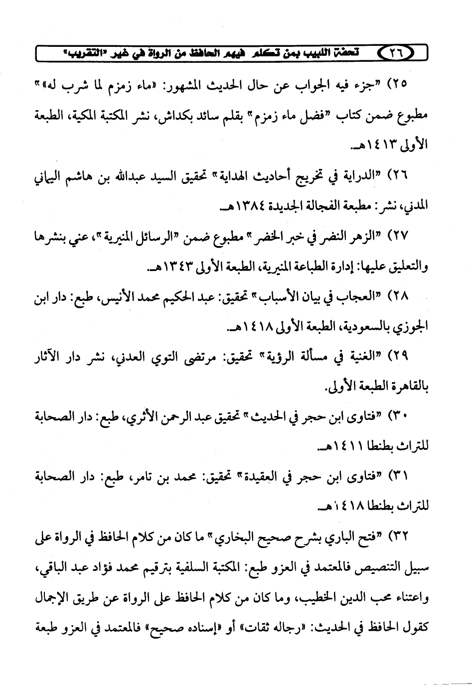 32) "فتح الباري بشرح صحيح البخاري" ما كان من كلام الحافظ في الرواة على سبيل التنصيص فالمعتمد في العزو طبع: المكتبة السلفية بترقيم محمد فؤاد عبد الباقي، واعتناء محب الدين الخطيب، وما كان من كلام الحافظ على الرواة عن طريق الإجمال يقول الحافظ في الحديث: "رجاله ثقات" أو "إسناده صحيح" فالمعتمد في العزو طبعة