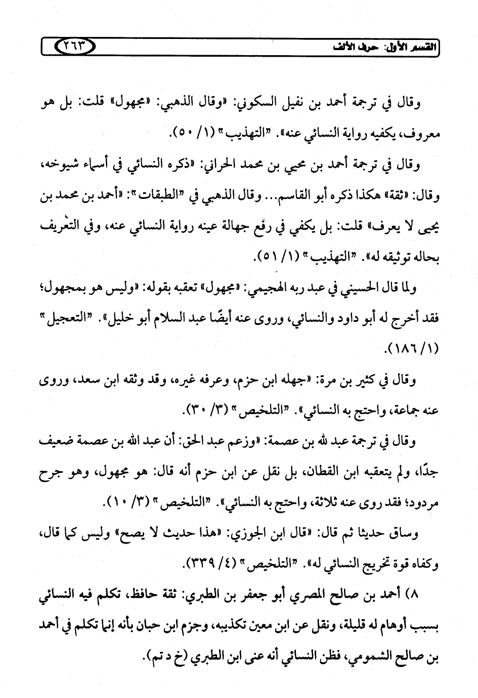 وقال في ترجمة أحمد بن نفيل السكوني: "وقال الذهبي: "مجهول" قلت: بل هو معروف، يكفيه رواية النسائي عنه"."التهذيب" (1/ 50).