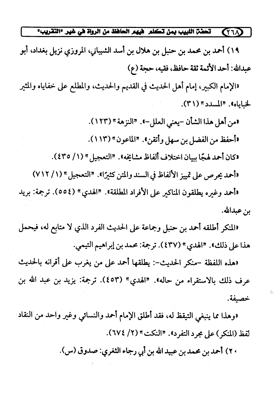 19) أحمد بن محمد بن حنبل بن هلال بن أسد الشيباني، المروزي نزيل بغداد، أبو عبد الله: أحد الأئمة ثقة حافظ، فقيه، حجة (ع)