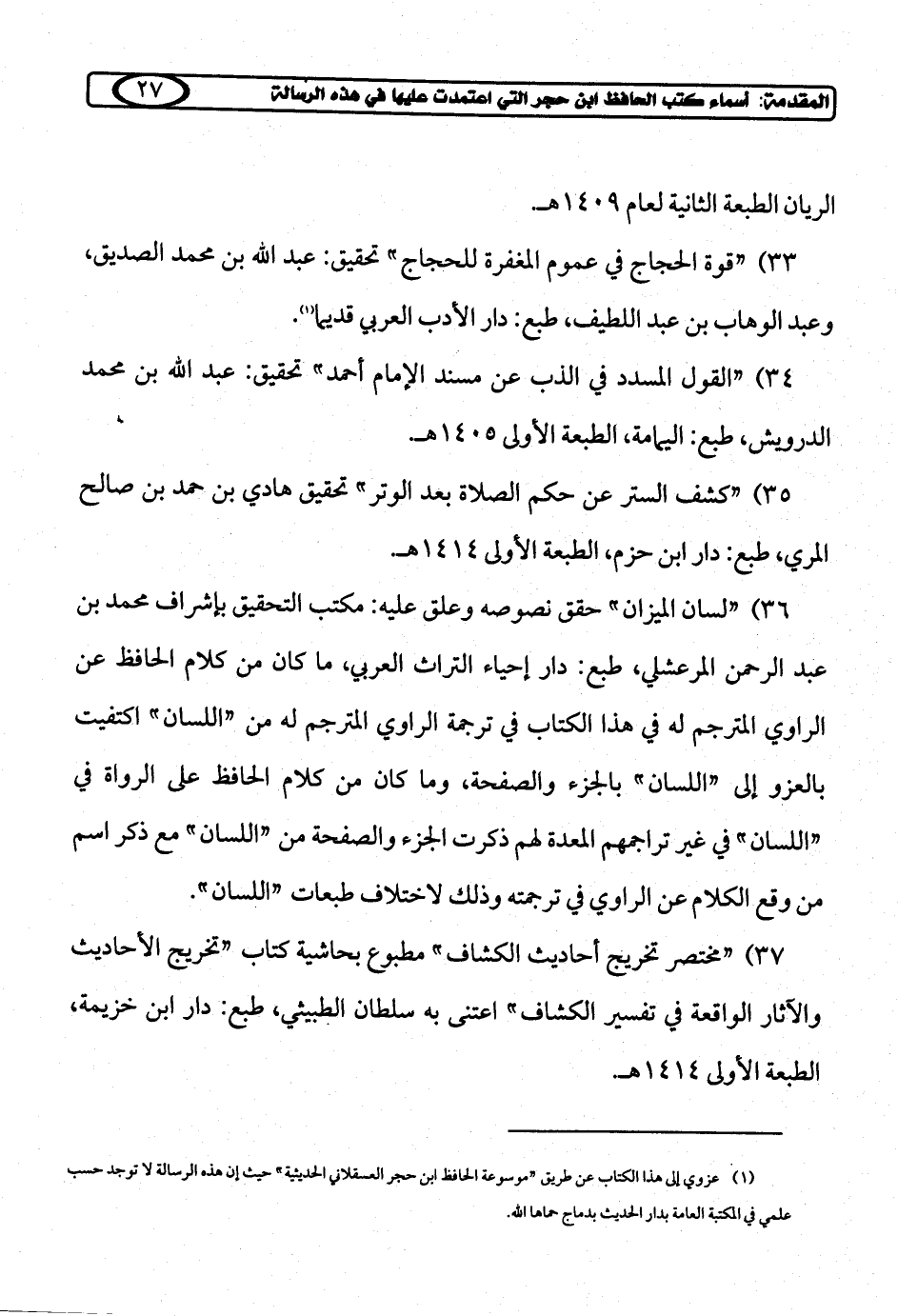 (¬1) عزوي إلى هذا الكتاب عن طريق "موسوعة الحافظ ابن حجر العسقلاني الحديثية" حيث إن هذه الرسالة لا توجد حسب علمي في المكتبة العامة بدار الحديث بدماج حماها الله.
