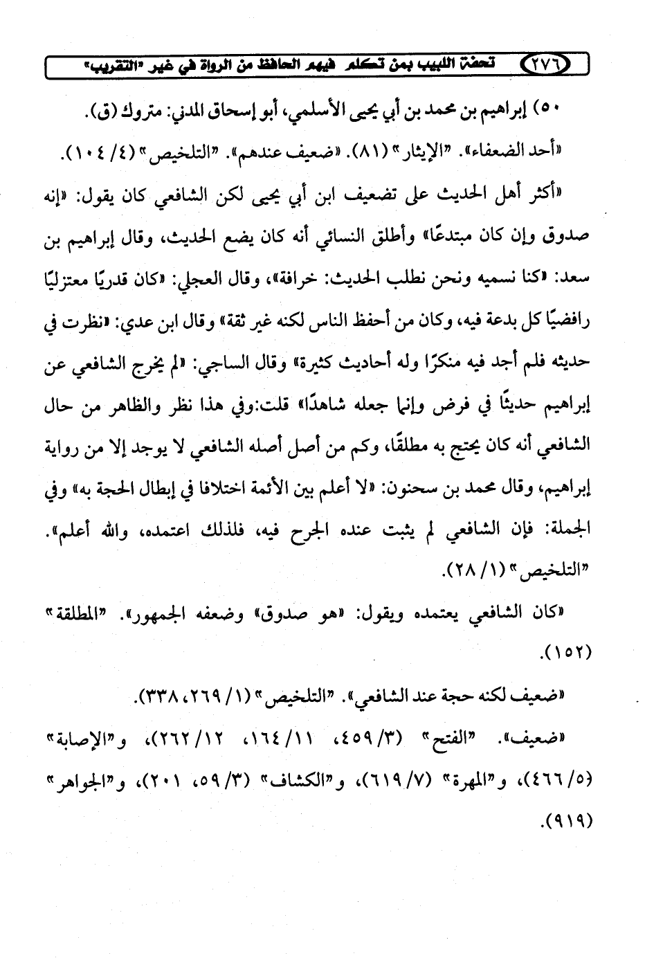 "أكثر أهل الحديث على تضعيف ابن أبي يحيى لكن الشافعي كان يقول: "إنه صدوق وإن كان مبتدعًا" وأطلق النسائي أنه كان يضع الحديث، وقال إبراهيم بن سعد: "كنا نسميه ونحن نطلب الحديث: خرافة"، وقال العجلي: "كان قدريًا معتزليًا رافضيًا كل بدعة فيه، وكان من أحفظ الناس لكنه غير ثقة" وقال ابن عدي: "نظرت في حديثه فلم أجد فيه منكرًا وله أحاديث كثيرة" وقال الساجي: "لم يخرج الشافعي عن إبراهيم حديثًا في فرض وإنما جعله شاهدًا" قلت: وفي هذا نظر والظاهر من حال الشافعي أنه كان يحتج به مطلقًا، وكم من أصل أصله الشافعي لا يوجد إلا من رواية إبراهيم، وقال محمد بن سحنون: "لا أعلم بين الأئمة اختلافا في إبطال الحجة به" وفي الجملة: فإن الشافعي لم يثبت عنده الجرح فيه، فلذلك اعتمده، والله أعلم". "التلخيص" (1/ 28).