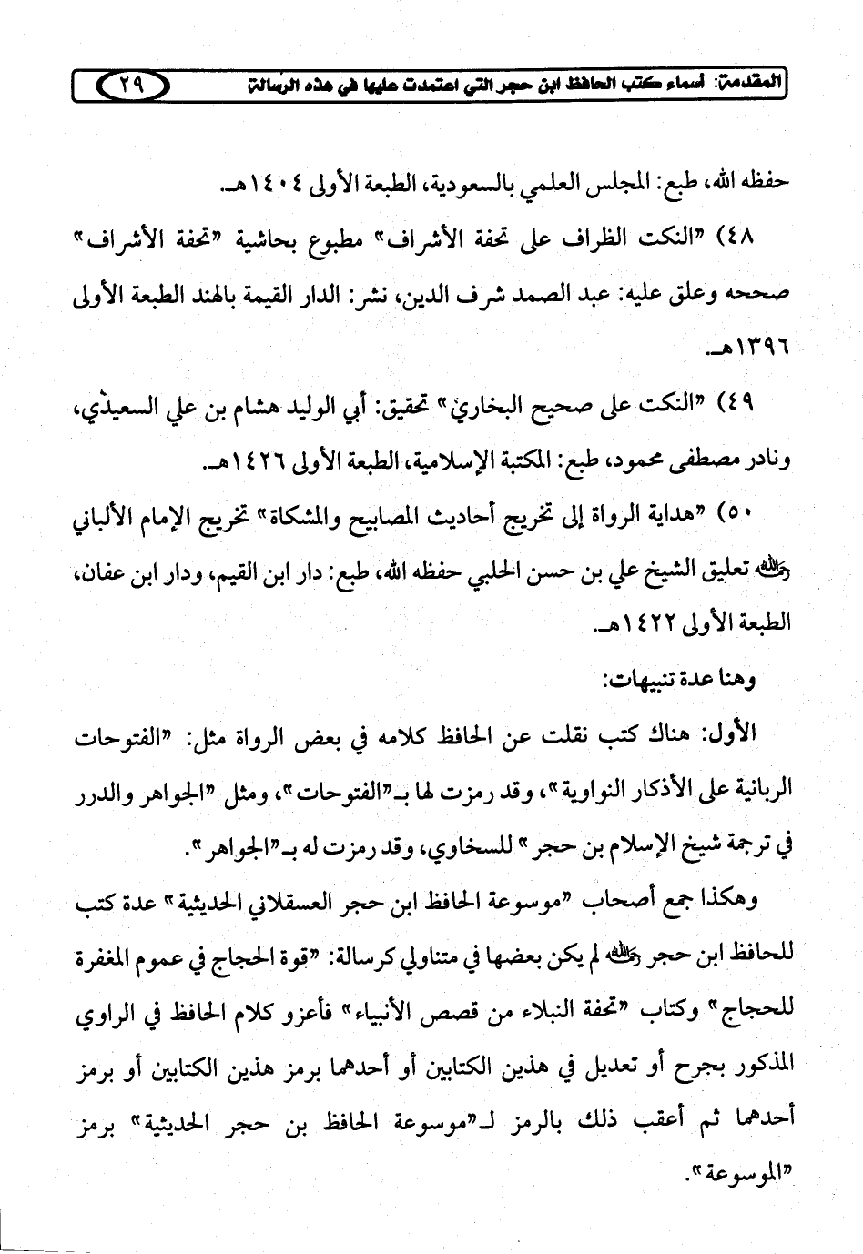 وهكذا جمع أصحاب "موسوعة الحافظ ابن حجر العسقلاني الحديثية" عدة كتب للحافظ ابن حجر رحمه الله لم يكن بعضها في متناولي كرسالة: "قوة الحجاج في عموم المغفرة للحجاج" وكتاب "تحفة النبلاء من قصص الأنبياء" فأعزو كلام الحافظ في الراوي المذكور بجرح أو تعديل في هذين الكتابين أو أحدهما برمز هذين الكتابين أو برمز أحدهما ثم أعقب ذلك بالرمز لـ "موسوعة الحافظ بن حجر الحديثية" برمز "الموسوعة".