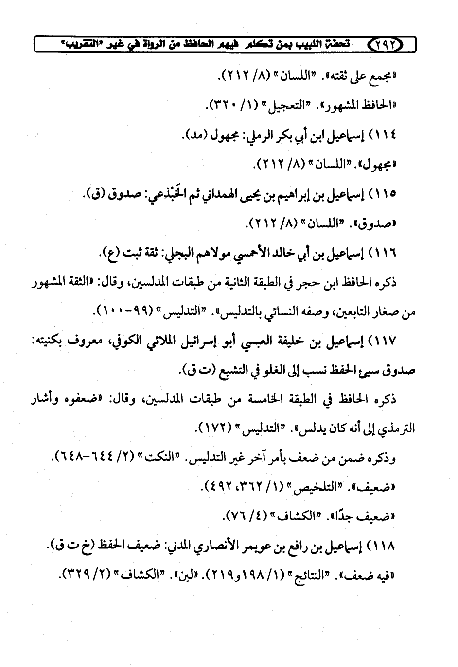 117) إسماعيل بن خليفة العبسي أبو إسرائيل الملائي الكوفي، معروف بكنيته: صدوق سيئ الحفظ نسب إلى الغلو في التشيع (ت ق).