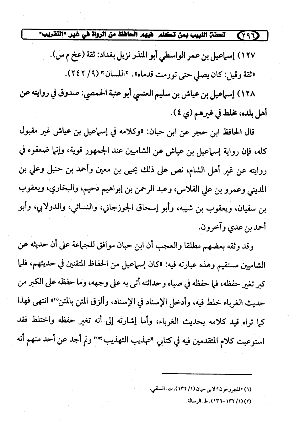 128) إسماعيل بن عياش بن سليم العنسي أبو عتبة الحمصي: صدوق في روايته عن أهل بلده، مخلط في غيرهم (ي 4).