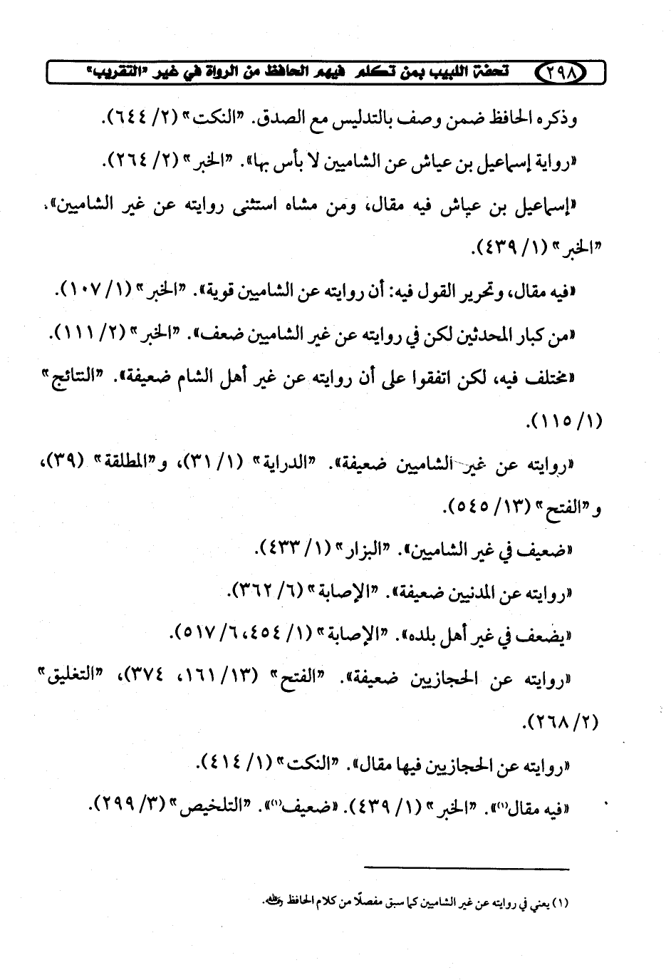 "روايته عن غير الشاميين ضعيفة". "الدراية" (1/ 31)، و"المطلقة" (39)، و"الفتح" (13/ 545).