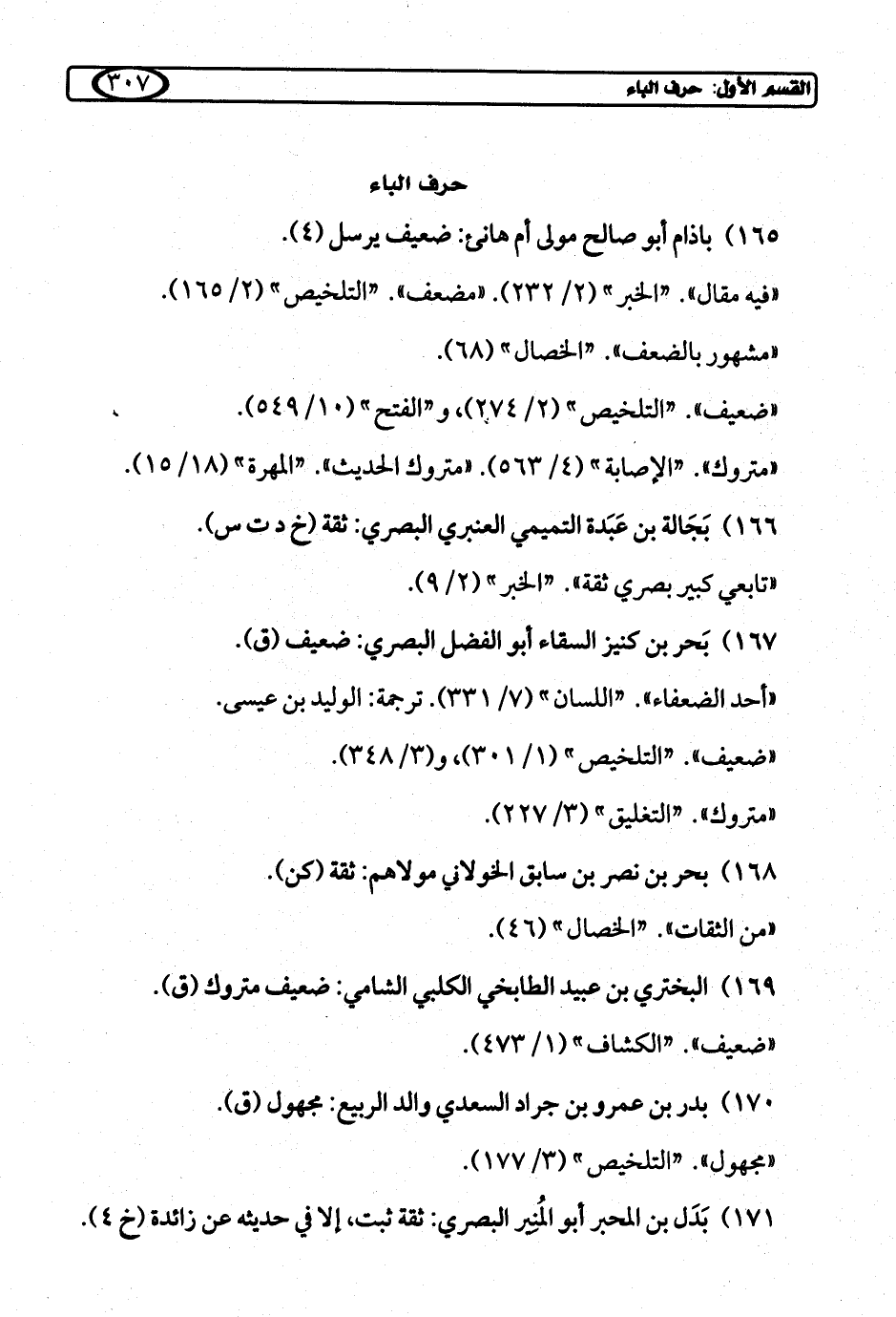 171) بَدَل بن المحبر أبو المُنِير البصري: ثقة ثبت، إلا في حديثه عن زائدة (خ 4).