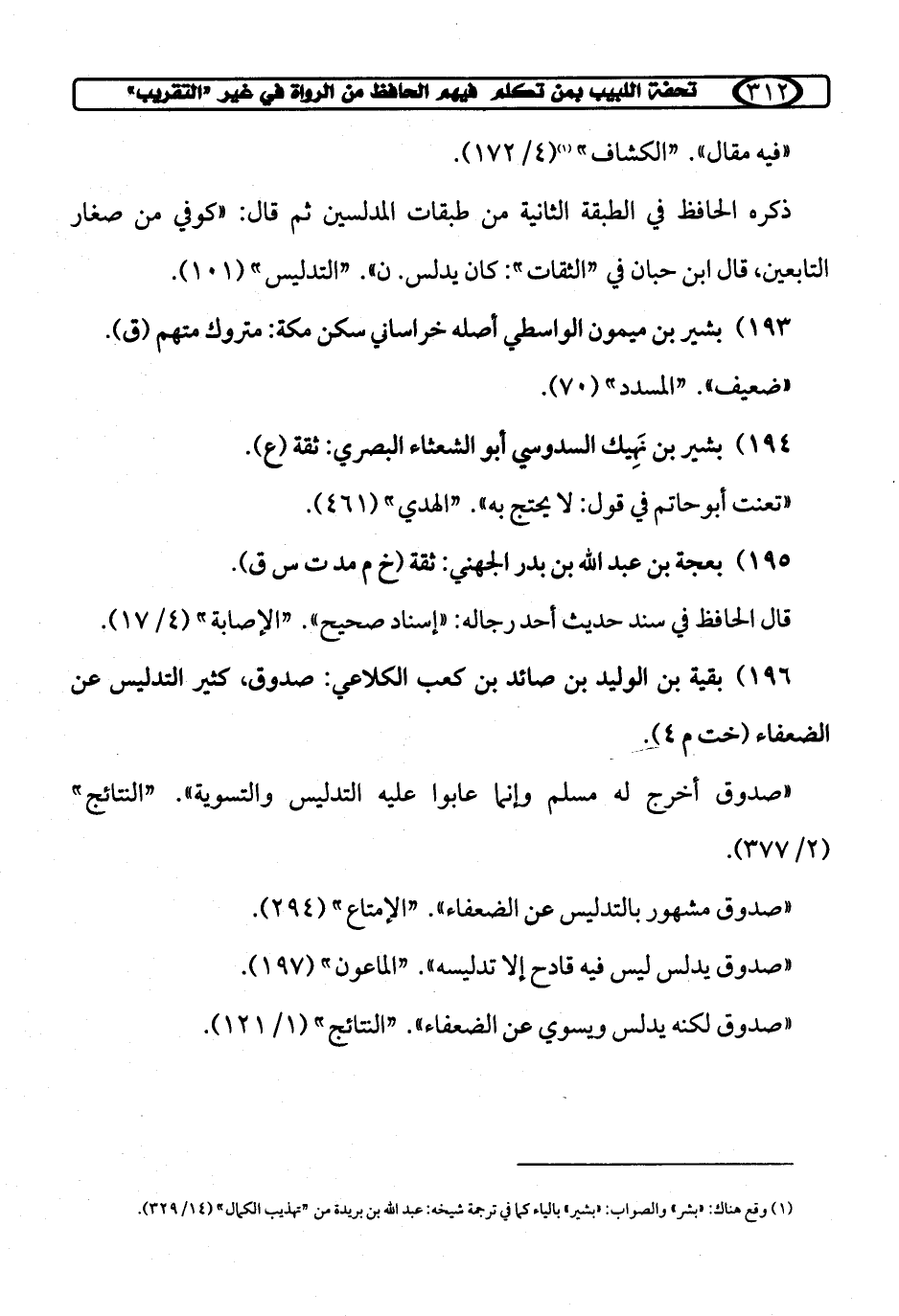 196) بقية بن الوليد بن صائد بن كعب الكلاعي: صدوق، كثير التدليس عن الضعفاء (خت م 4).