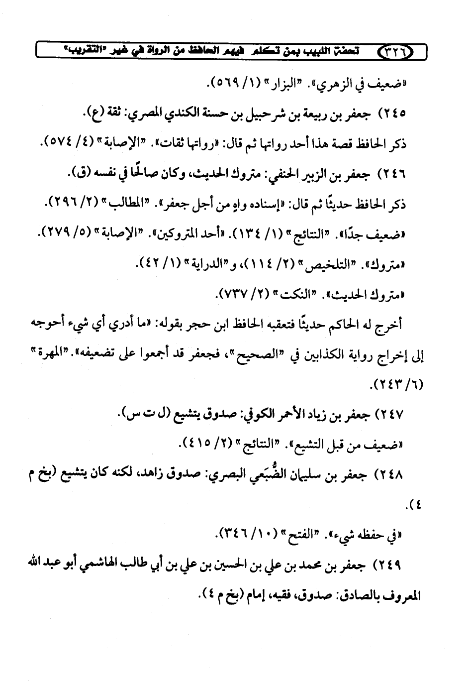 249) جعفر بن محمد بن علي بن الحسين بن علي بن أبي طالب الهاشمي أبو عبد الله المعروف بالصادق: صدوق، فقيه، إمام (بخ م 4).