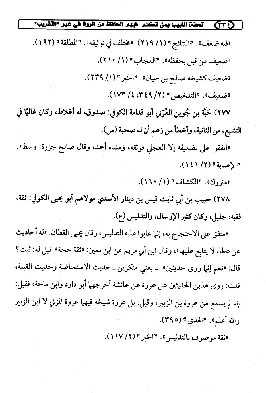 278) حبيب بن أبي ثابت قيس بن دينار الأسدي مولاهم أبو يحيى الكوفي: ثقة، فقيه، جليل، وكان كثير الإرسال، والتدليس (ع).
