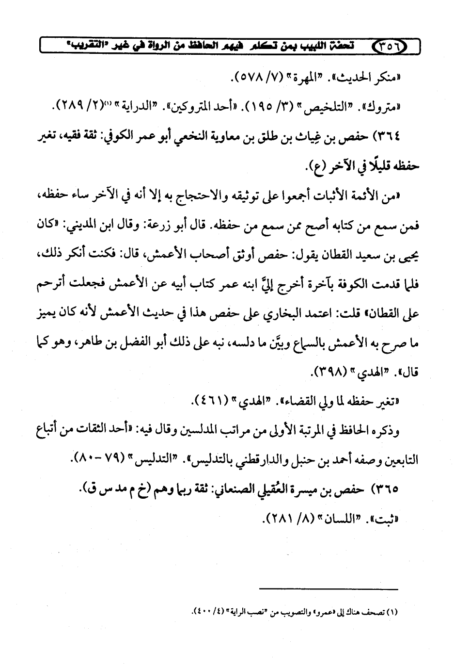 364) حفص بن غِياث بن طلق بن معاوية النخعي أبو عمر الكوفي: ثقة فقيه، تغير حفظه قليلًا في الآخر (ع).