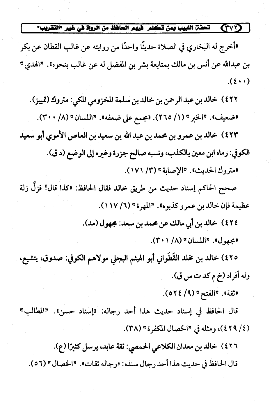 425) خالد بن مخلد القَطَواني أبو الهيثم البجلي مولاهم الكوفي: صدوق، يتشيع، وله أفراد (خ م كد ت س ق).