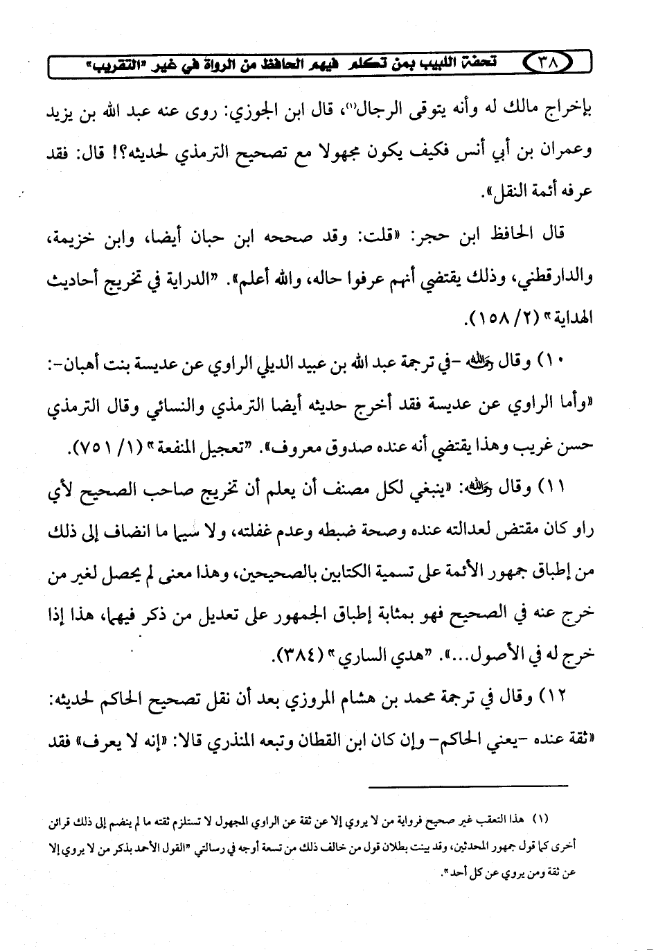 12) وقال في ترجمة محمد بن هشام المروزي بعد أن نقل تصحيح الحاكم لحديثه: "ثقة عنده - يعني الحاكم - وإن كان ابن القطان وتبعه المنذري قالا: "إنه لا يعرف" فقد