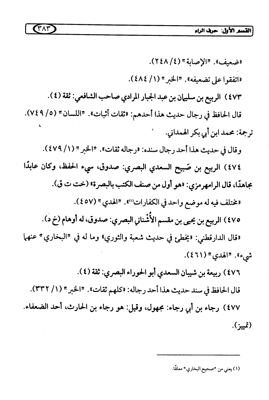 474) الربيع بن صَبيح السعدي البصري: صدوق، سيء الحفظ، وكان عابدًا مجاهدًا، قال الرامهرمزي: "هو أول من صنف الكتب بالبصرة" (خت ت ق).