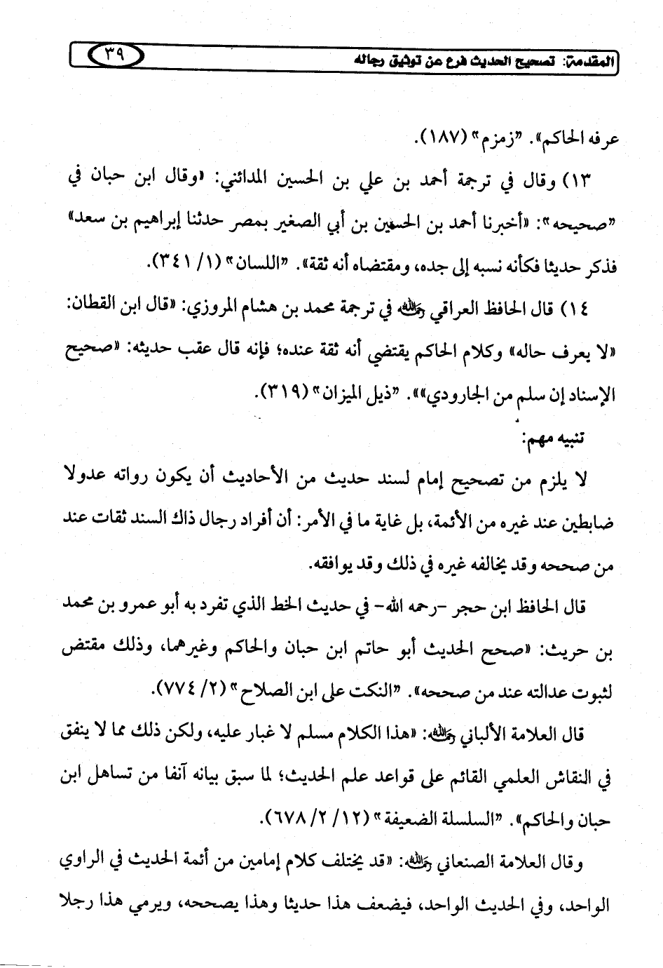 14) قال الحافظ العراقي رحمه الله في ترجمة محمد بن هشام المروزي: "قال ابن القطان: "لا يعرف حاله" وكلام الحاكم يقتضي أنه ثقة عنده؛ فإنه قال عقب حديثه: "صحيح الإسناد إن سليم من الجارودي"". "ذيل الميزان" (319).