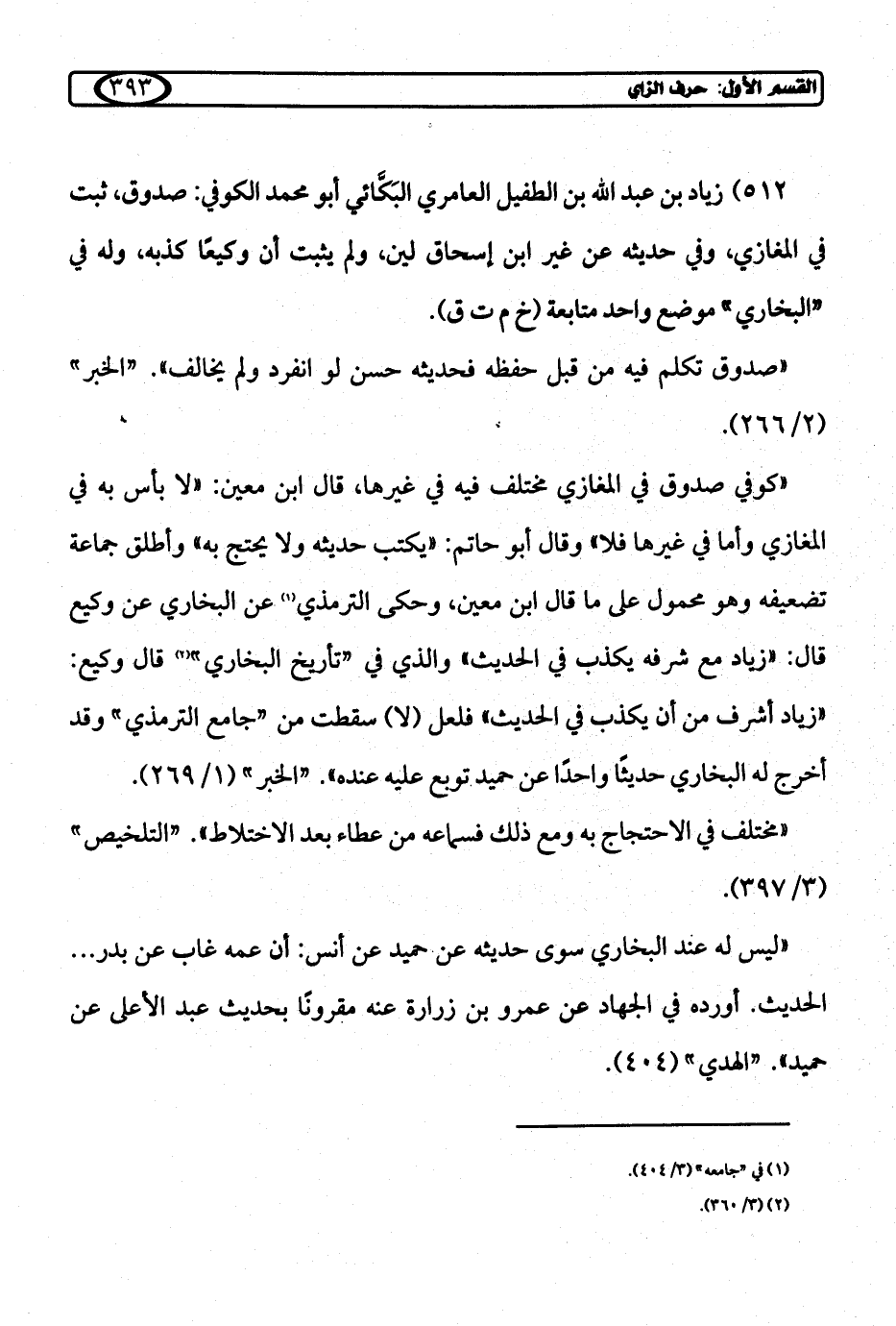 "كوفي صدوق في المغازي مختلف فيه في غيرها، قال ابن معين: "لا بأس به في المغازي وأما في غيرها فلا" وقال أبو حاتم: "يكتب حديثه ولا يحتج به" وأطلق جماعة تضعيفه وهو محمول على ما قال ابن معين، وحكى الترمذي (¬1) عن البخاري عن وكيع قال: "زياد مع شرفه يكذب في الحديث" والذي في "تأريخ البخاري" (¬2) قال وكيع: "زياد أشرف من أن يكذب في الحديث" فلعل (لا) سقطت من "جامع الترمذي" وقد أخرج له البخاري حديثًا واحدًا عن حميد توبع عليه عنده". "الخبر" (1/ 269).