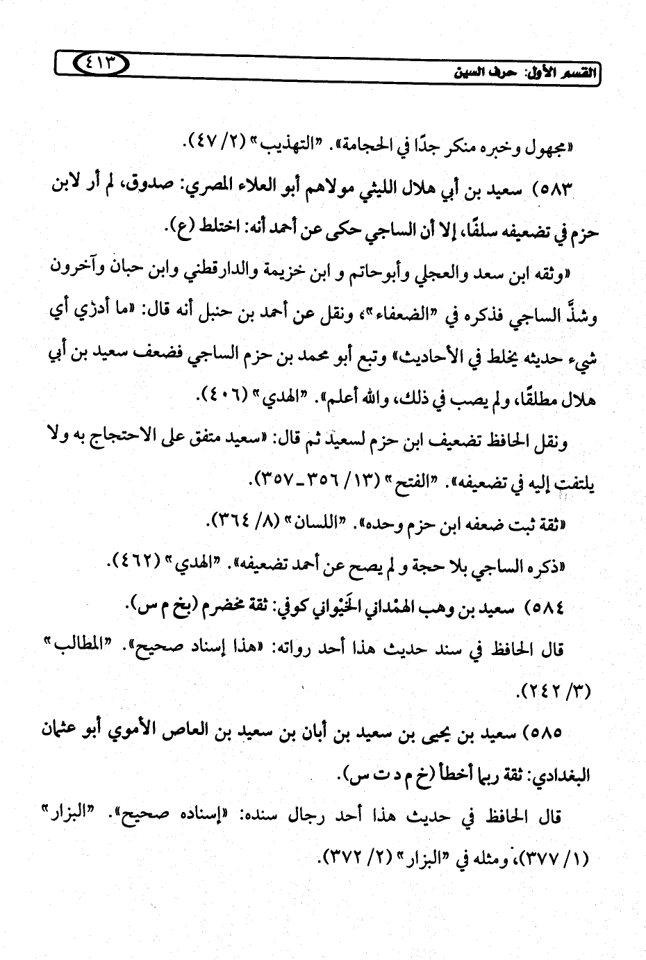 583) سعيد بن أبي هلال الليثي مولاهم أبو العلاء المصري: صدوق، لم أر لابن حزم في تضعيفه سلفًا، إلا أن الساجي حكى عن أحمد أنه: اختلط (ع).