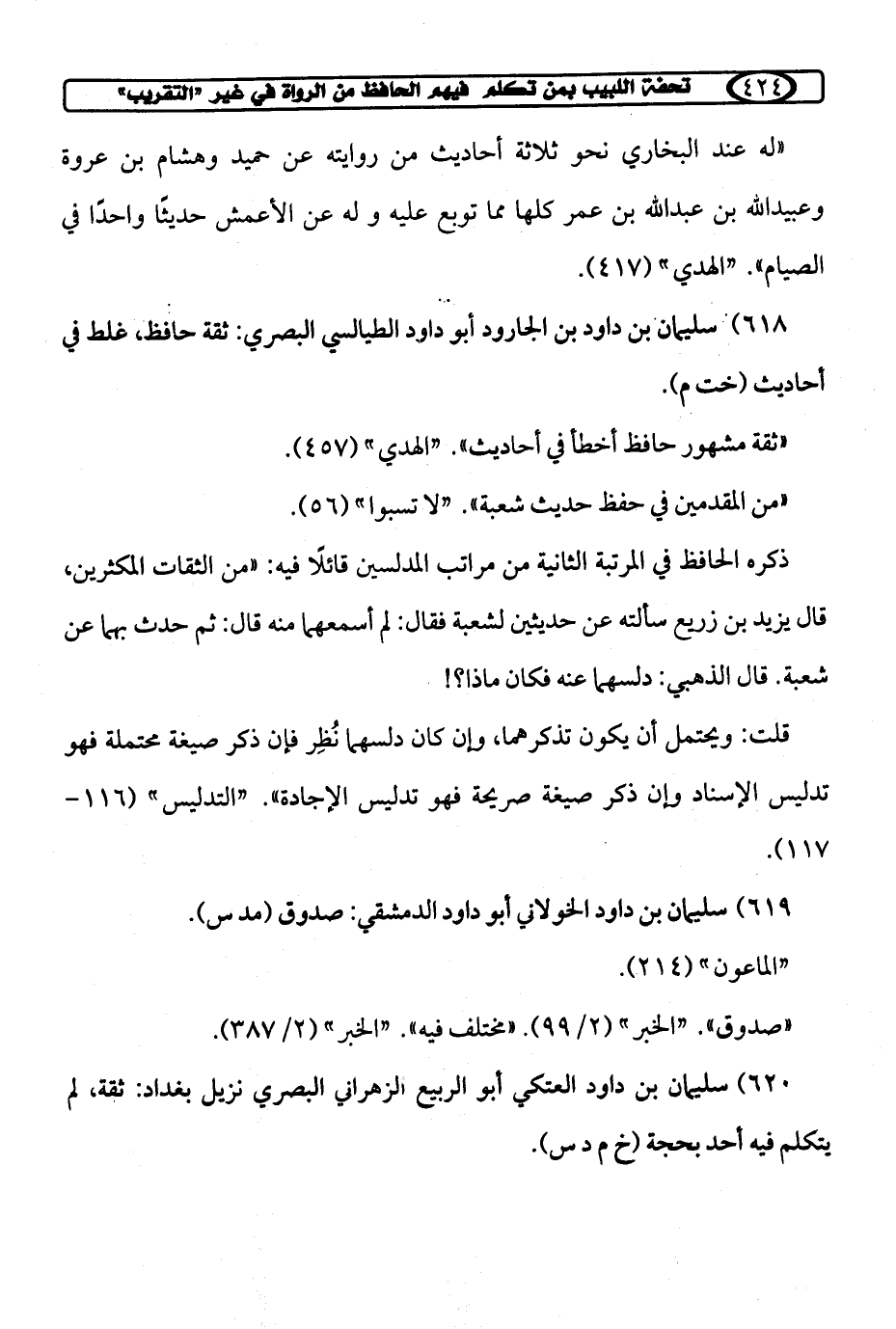 620) سليمان بن داود العتكي أبو الربيع الزهراني البصري نزيل بغداد: ثقة، لم يتكلم فيه أحد بحجة (خ م د س).