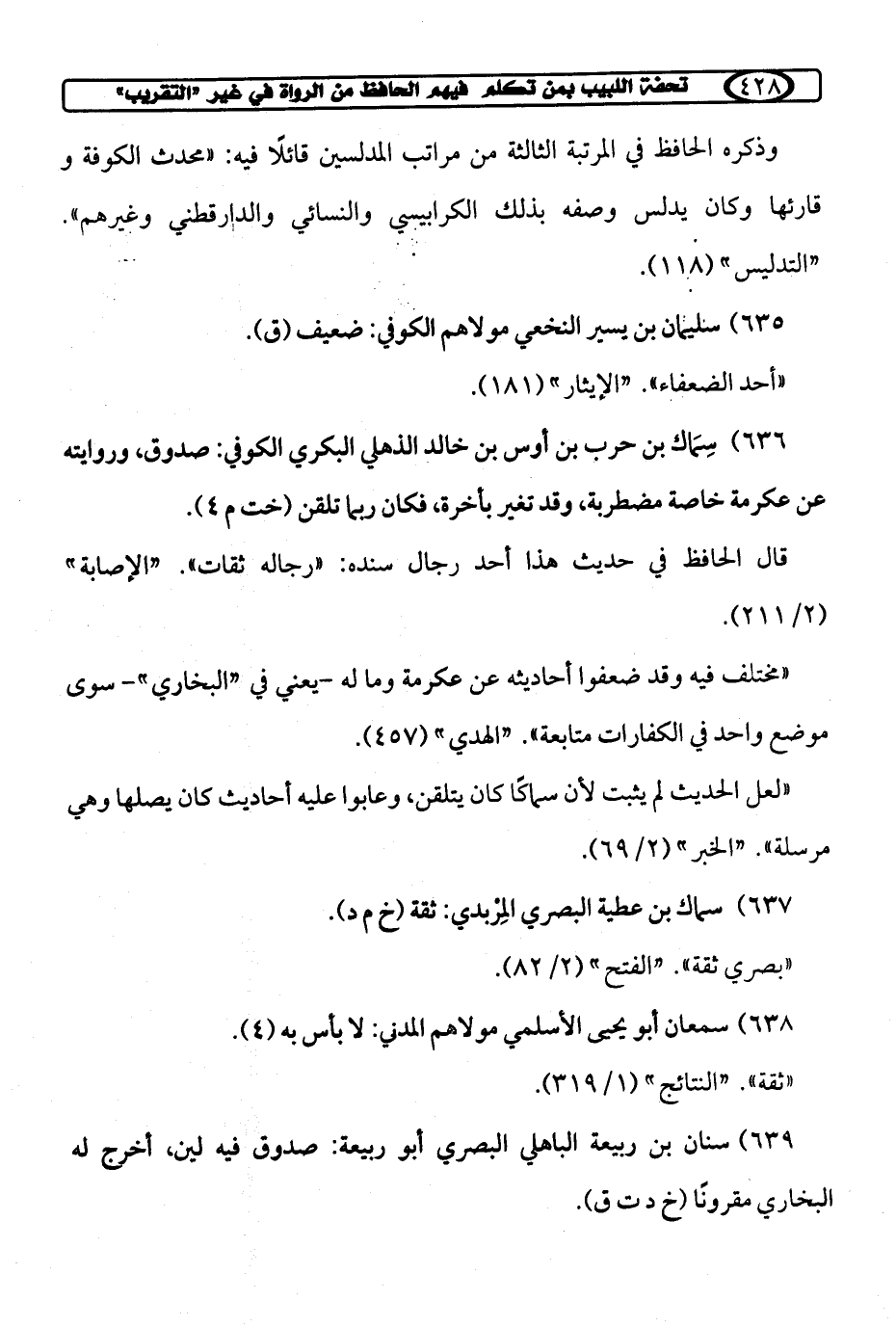 636) سِمَاك بن حرب بن أوس بن خالد الذهلي البكري الكوفي: صدوق، وروايته عن عكرمة خاصة مضطربة، وقد تغير بأخرة، فكان ربما تلقن (خت م 4).