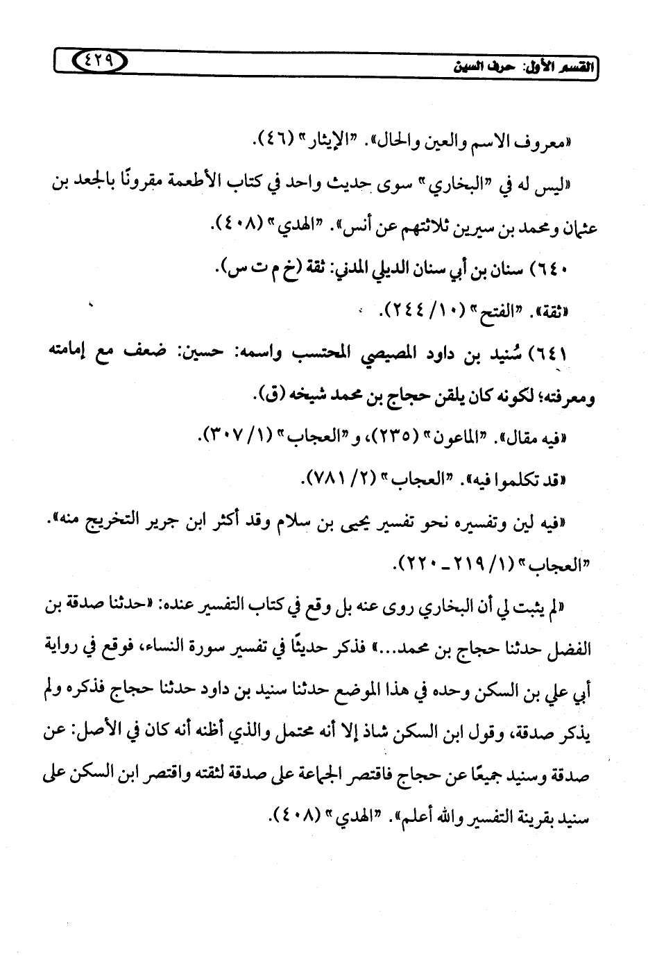 641) سُنيد بن داود المصيصي المحتسب واسمه: حسين: ضعف مع إمامته ومعرفته؛ لكونه كان يلقن حجاج بن محمد شيخه (ق).