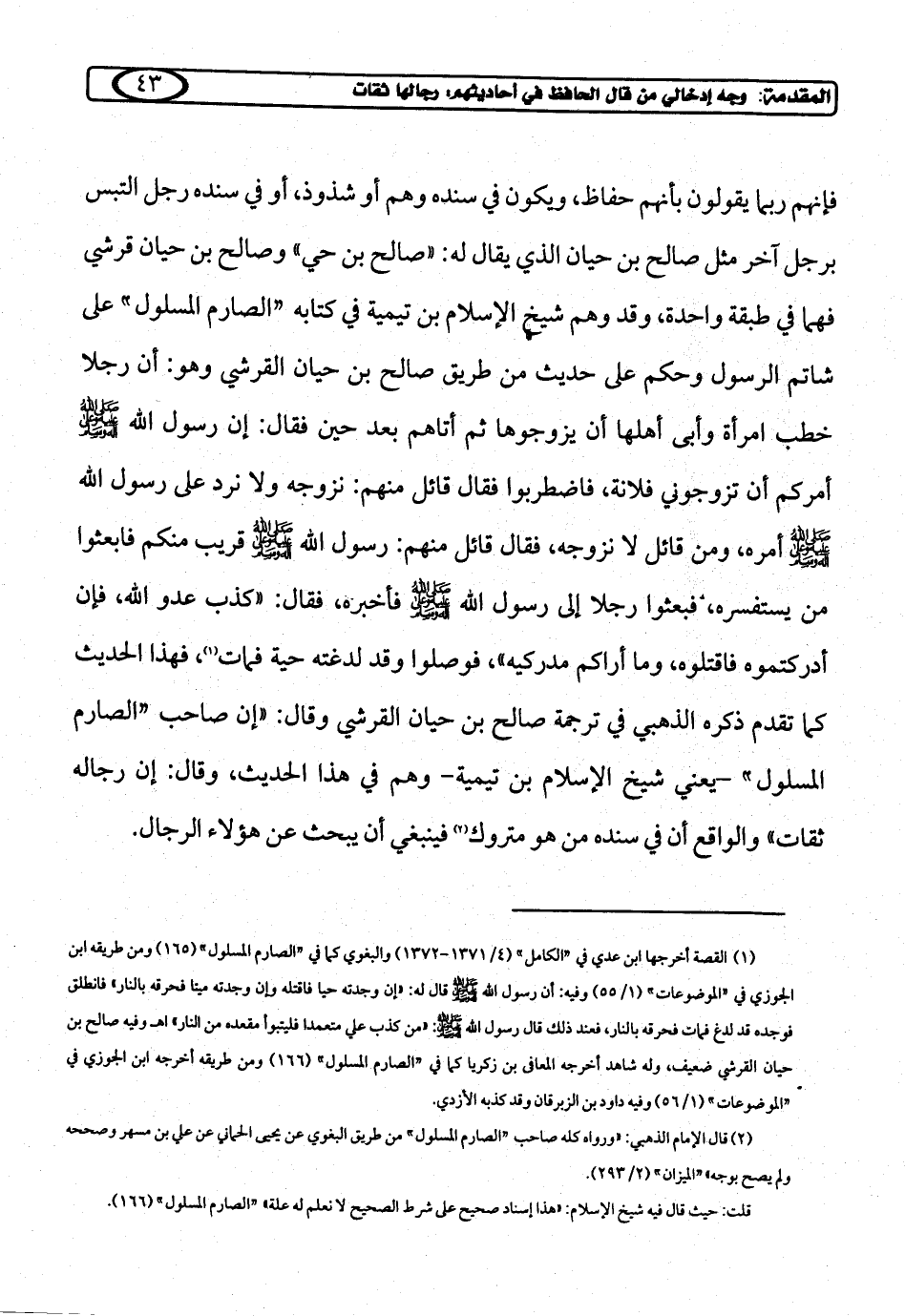 فإنهم ربما يقولون بأنهم حفاظ، ويكون في سنده وهم أو شذوذ، أو في سنده رجل التبس برجل آخر مثل صالح بن حيان الذي يقال له: "صالح بن حي" وصالح بن حيان قرشي فهما في طبقة واحدة، وقد وهم شيخ الإسلام بن تيمية في كتابه "الصارم المسلول" على شاتم الرسول وحكم على حديث من طريق صالح بن حيان القرشي وهو: أن رجلا خطب امرأة وأبى أهلها أن يزوجوها ثم أتاهم بعد حين فقال: إن رسول الله - صلى الله عليه وسلم - أمركم أن تزوجوني فلانة، فاضطربوا فقال قائل منهم: نزوجه ولا نرد على رسول الله - صلى الله عليه وسلم - أمره، ومن قائل لا نزوجه، فقال قائل منهم: رسول الله - صلى الله عليه وسلم - قريب منكم فابعثوا من يستفسره، فبعثوا رجلا إلى رسول الله - صلى الله عليه وسلم - فأخبره، فقال: "كذب عدو الله، فإن أدركتموه فاقتلوه، وما أراكم مدركيه"، فوصلوا وقد لدغته حية فمات (¬1)، فهذا الحديث كما تقدم ذكره الذهبي في ترجمة صالح بن حيان القرشي وقال: "إن صاحب "الصارم المسلول" - يعني شيخ الإسلام بن تيمية - وهم في هذا الحديث، وقال: إن رجاله ثقات" والواقع أن في سنده من هو متروك (¬2) فينبغي أن يبحث عن هؤلاء الرجال.