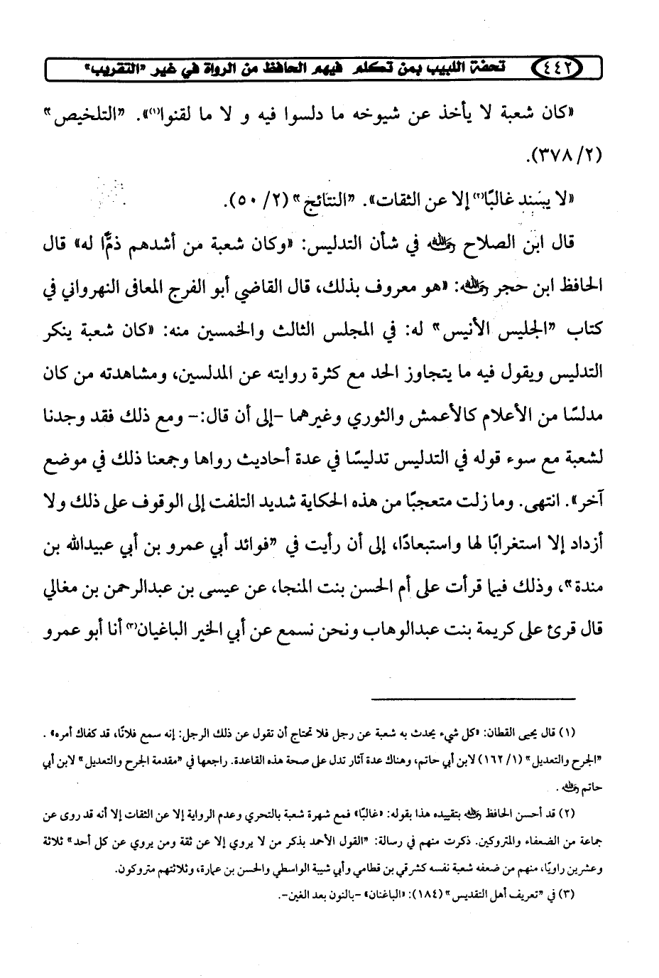 قال ابن الصلاح رحمه الله في شأن التدليس: "وكان شعبة من أشدهم ذمًّا له" قال الحافظ ابن حجر رحمه الله: "هو معروف بذلك، قال القاضي أبو الفرج المعافى النهرواني في كتاب "الجليس الأنيس" له: في المجلس الثالث والخمسين منه: "كان شعبة ينكر التدليس ويقول فيه ما يتجاوز الحد مع كثرة روايته عن المدلسين، ومشاهدته من كان مدلسًا من الأعلام كالأعمش والثوري وغيرهما - إلى أن قال: - ومع ذلك فقد وجدنا لشعبة مع سوء قوله في التدليس تدليسًا في عدة أحاديث رواها وجمعنا ذلك في موضع آخر". انتهى. وما زلت متعجبًا من هذه الحكاية شديد التلفت إلى الوقوف على ذلك ولا أزداد إلا استغرابًا لها واستبعادًا، إلى أن رأيت في "فوائد أبي عمرو بن أبي عبيد الله بن مندة"، وذلك فيما قرأت على أم الحسن بنت المنجا، عن عيسى بن عبد الرحمن بن مغالي قال قرئ على كريمة بنت عبد الوهاب ونحن نسمع عن أبي الخير الباغيان (¬3) أنا أبو عمرو