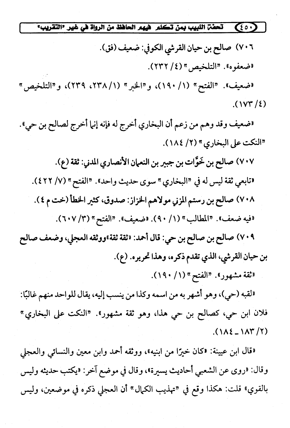 709) صالح بن صالح بن حي: قال أحمد: "ثقة ثقة" ووثقه العجلي، وضعف صالح بن حيان القرشي، الذي تقدم ذكره، وهذا تحريره. (ع).