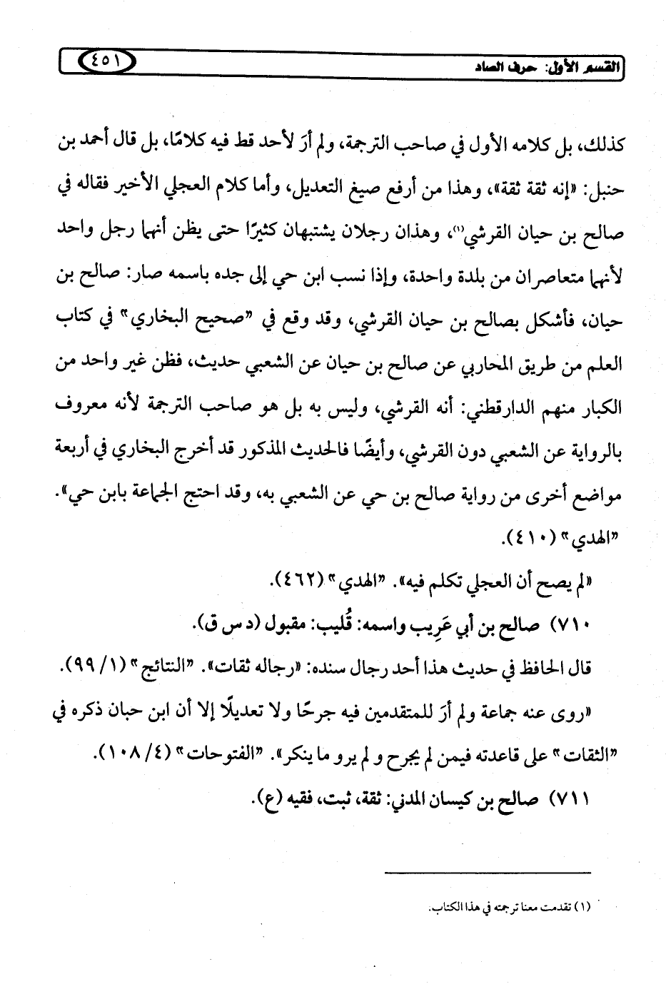 كذلك، بل كلامه الأول في صاحب الترجمة، ولم أرَ لأحد قط فيه كلامًا، بل قال أحمد بن حنبل: "إنه ثقة ثقة"، وهذا من أرفع صيغ التعديل، وأما كلام العجلي الأخير فقاله في صالح بن حيان القرشي (¬1)، وهذان رجلان يشتبهان كثيرًا حتى يظن أنهما رجل واحد لأنهما متعاصران من بلدة واحدة، وإذا نسب ابن حي إلى جده باسمه صار: صالح بن حيان، فأشكل بصالح بن حيان القرشي، وقد وقع في "صحيح البخاري" في كتاب العلم من طريق المحاربي عن صالح بن حيان عن الشعبي حديث، فظن غير واحد من الكبار منهم الدارقطني: أنه القرشي، وليس به بل هو صاحب الترجمة لأنه معروف بالرواية عن الشعبي دون القرشي، وأيضًا فالحديث المذكور قد أخرج البخاري في أربعة مواضع أخرى من رواية صالح بن حي عن الشعبي به، وقد احتج الجماعة بابن حي". "الهدي" (410).