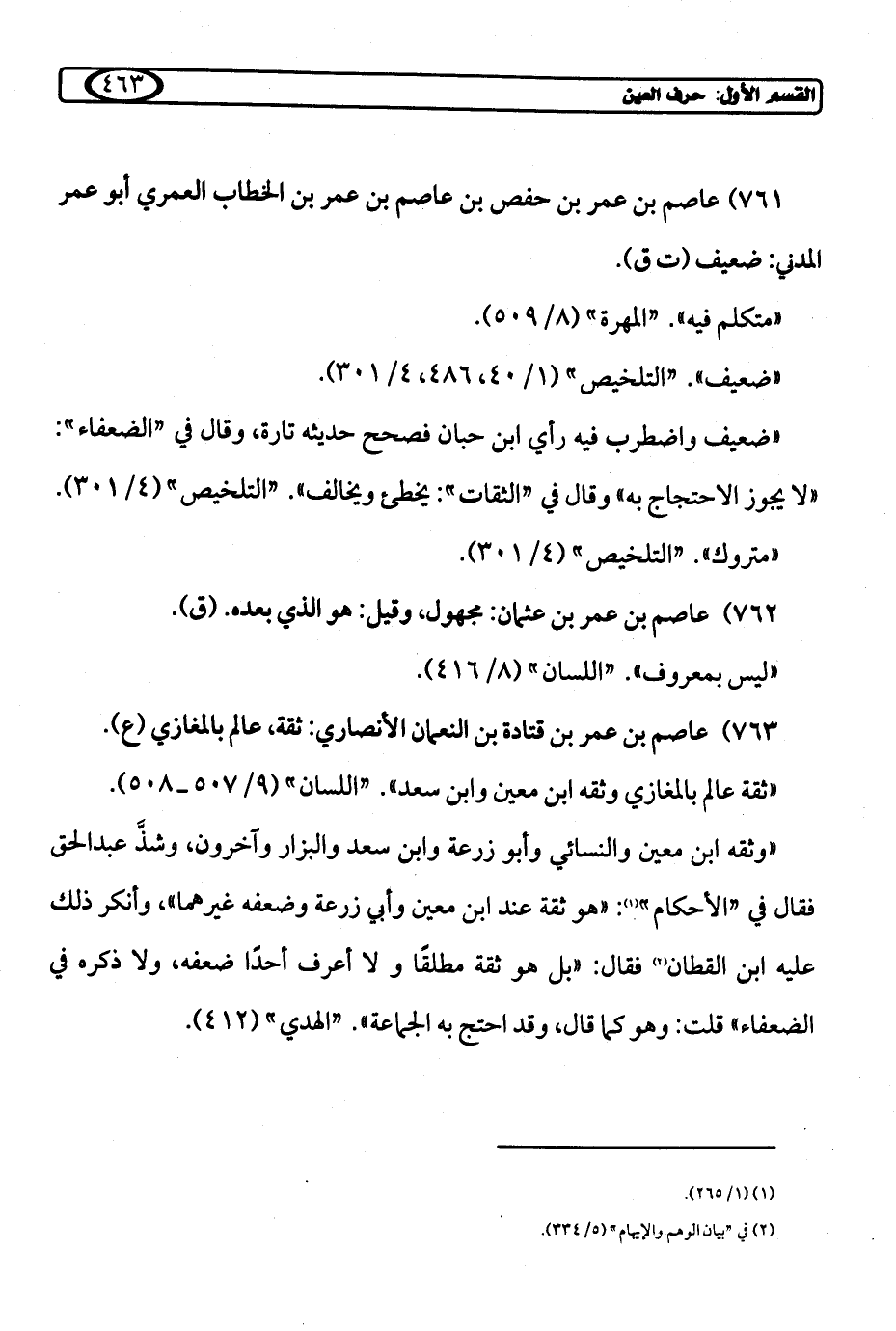 762) عاصم بن عمر بن عثمان: مجهول، وقيل: هو الذي بعده. (ق).