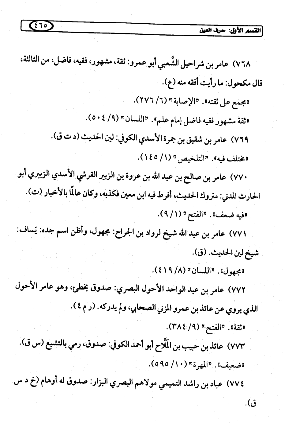768) عامر بن شراحيل الشَّعبي أبو عمرو: ثقة، مشهور، فقيه، فاضل، من الثالثة، قال مكحول: ما رأيت أفقه منه (ع).