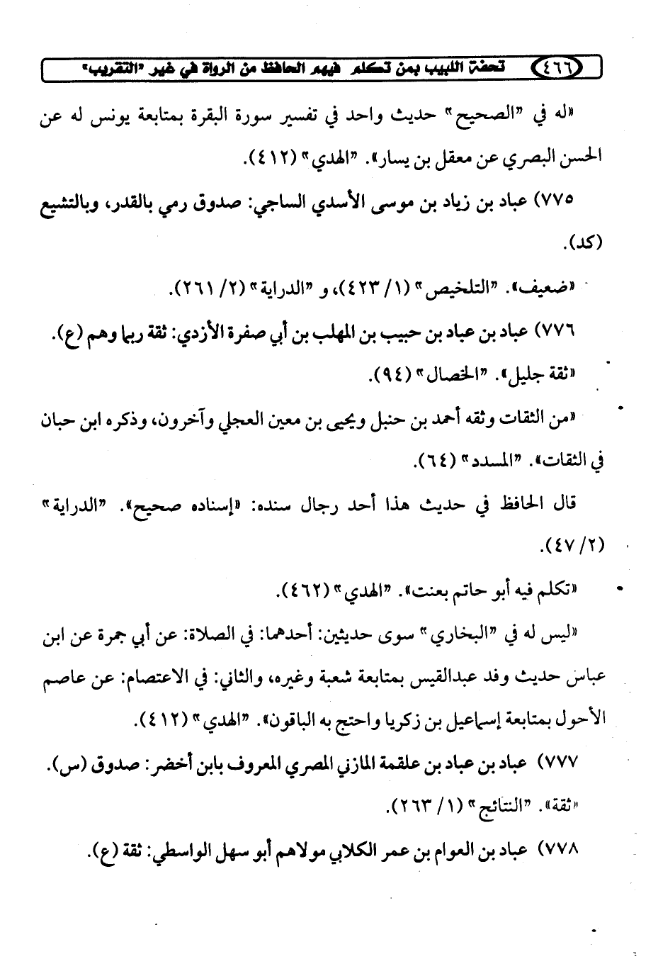 775) عباد بن زياد بن موسى الأسدي الساجي: صدوق رمي بالقدر، وبالتشيع (كد).