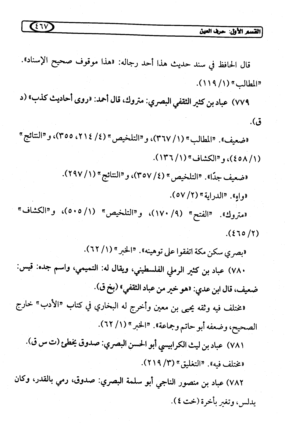 780) عباد بن كثير الرملي الفلسطيني، ويقال له: التميمي، واسم جده: قيس: ضعيف، قال ابن عدي: "هو خير من عباد الثقفي" (بخ ق).